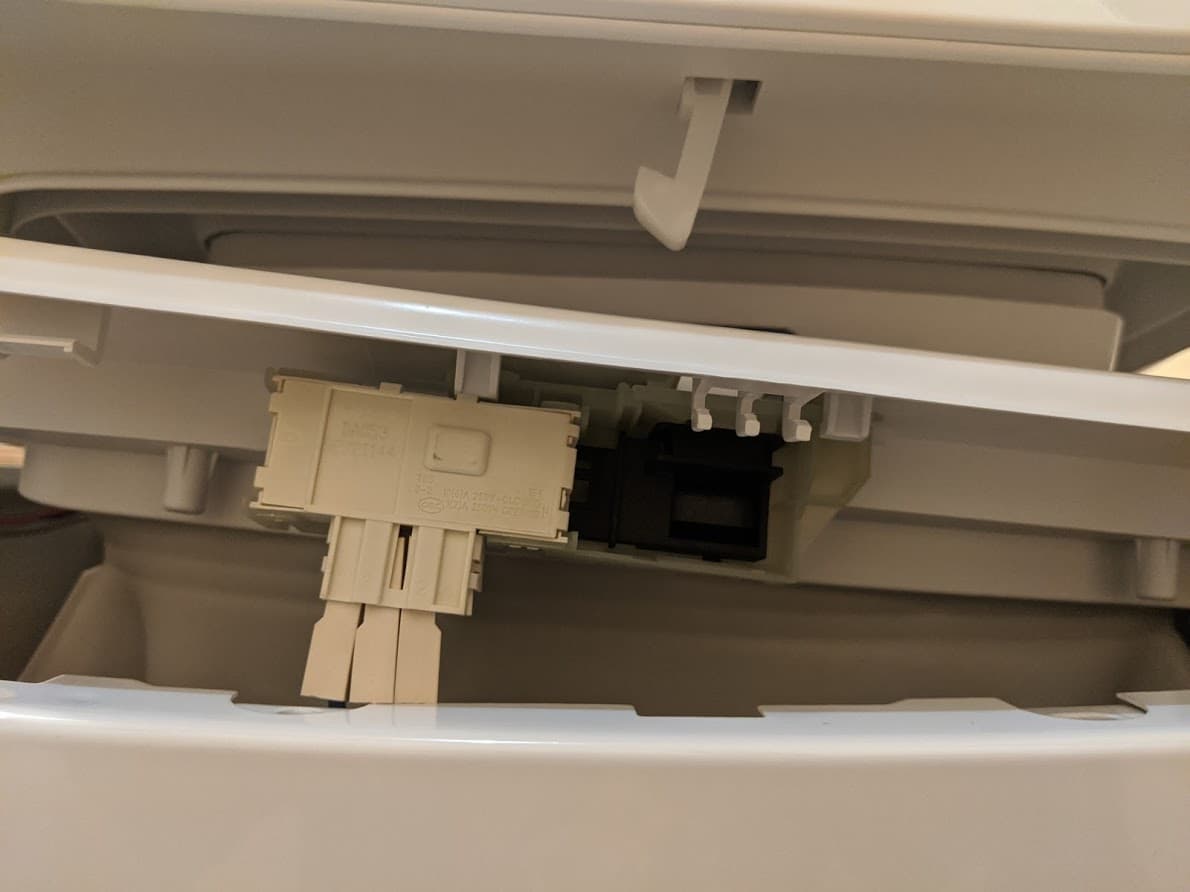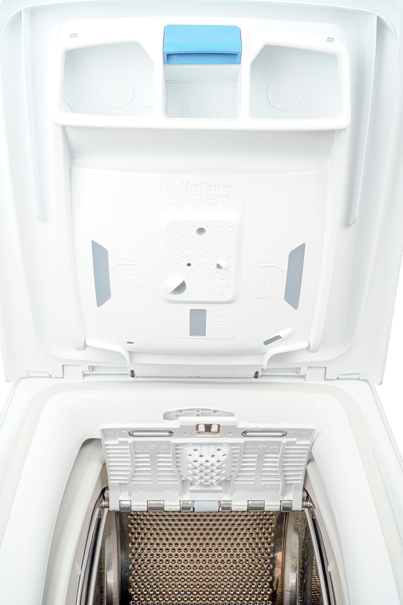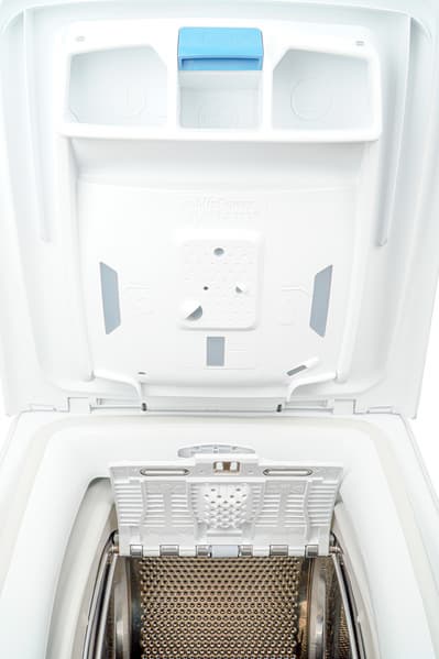 У контейнера для моющих средств три отсека: слева для стирального порошка, справа — для жидких моющих средств и в середине — для кондиционера. Чтобы его почистить, надо нажать на синюю клавишу в верхней части: тогда емкость отделится от крышки бака.