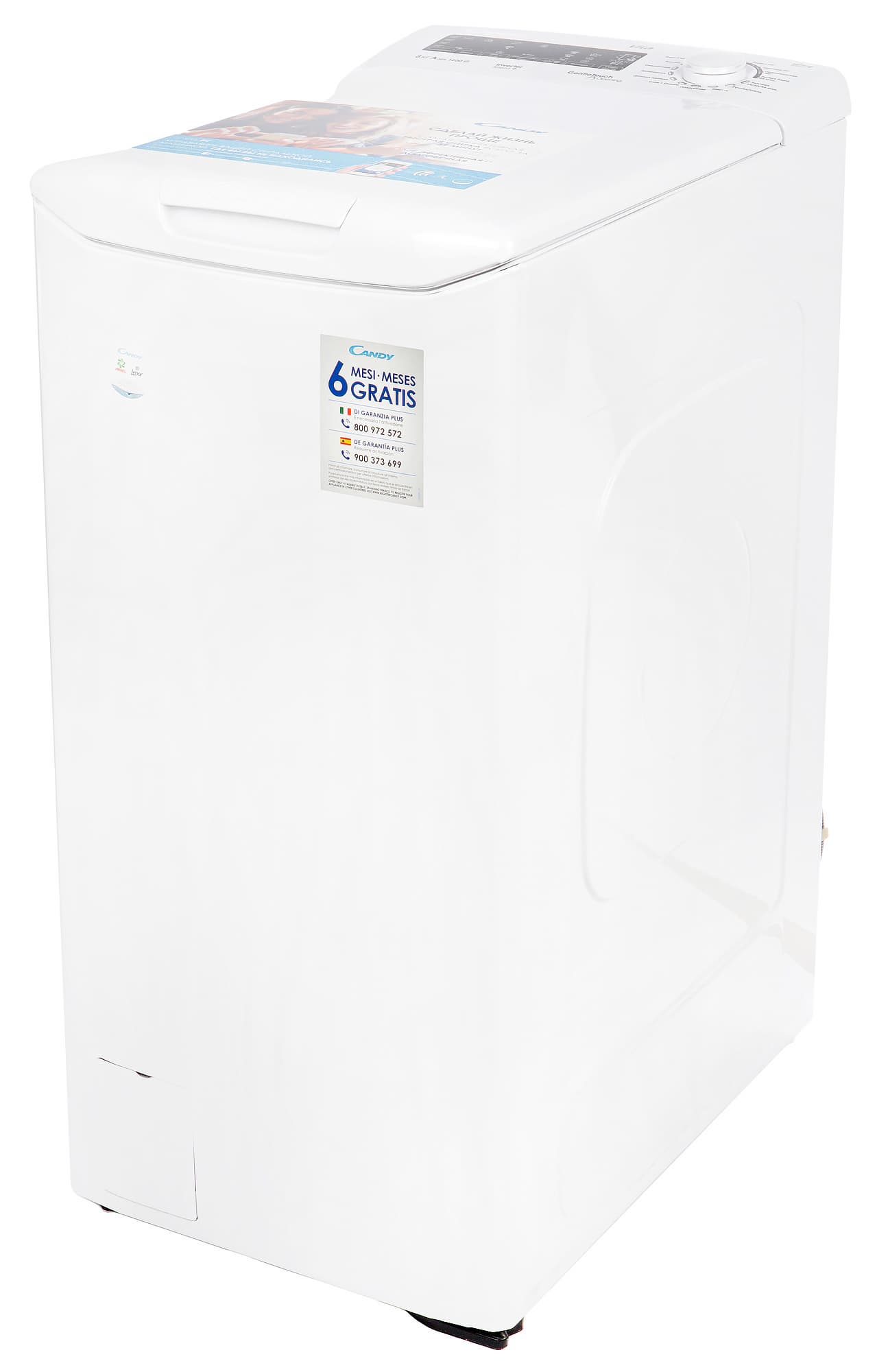 Внешностью Candy CVFTGP384TMH-07 не отличается от большинства стиральных машин с вертикальной загрузкой: это белый параллелепипед с глянцевым покрытием, люком в верхней части и органами управления, размещенными рядом с ним.