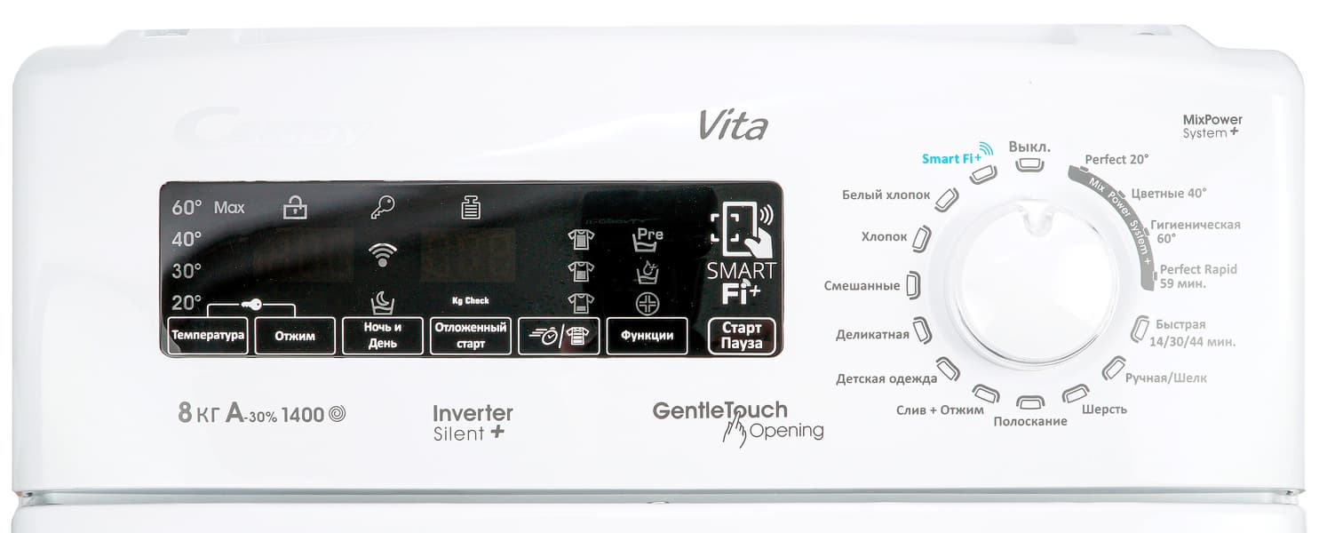 Выбор программ осуществляется вращения селектора в правой части панели. У Candy CVFTGP384TMH-07 солидный набор режимов с возможностью ручной регулировки в широких пределах температуры воды при стирке и скорости отжима. В таблице ниже мы приводим значения по умолчанию для каждой из программ и возможный диапазон ручных настроек.