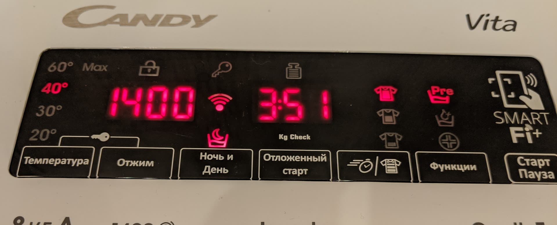 Оценку времени выполнения программы машина производит весьма приблизительно. Первые пару минут стирки она работает в режиме оценки загрузки: на дисплее горит надпись «Kg check», а светодиоды вокруг индикатора времени мигают. После завершения этого этапа прогнозируемое время работы уменьшается (иногда — довольно существенно). Однако не стоит этому безоговорочно верить: этапы стирки или отжима могут существенно затянуться. Особенно это заметно на последних полосканиях — оставшиеся десять минут превращаются в пятнадцать, двадцать и более.
