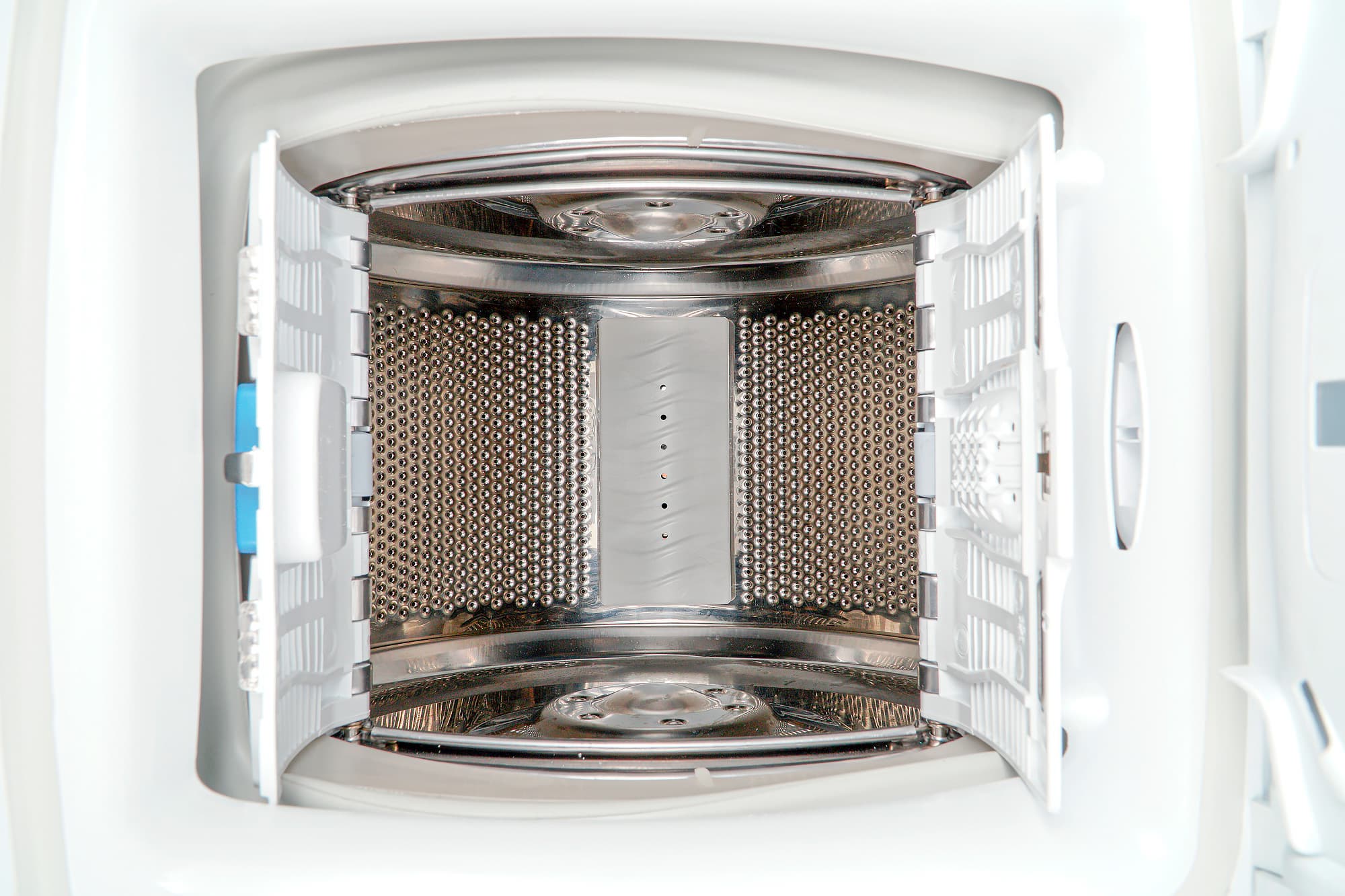 Барабан выполнен из нержавеющей стали. Его пластиковые дверцы закрываются на металлическую защелку, а открываются нажатием на клавишу синего цвета.