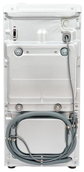 Задняя панель металлическая. В верхней части расположена розетка для подключения заливного шланга — она снабжена сеткой, защищающей машину от возможных загрязнений и ржавчины из водопроводной воды.