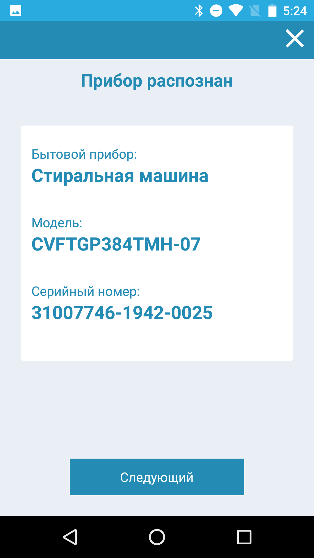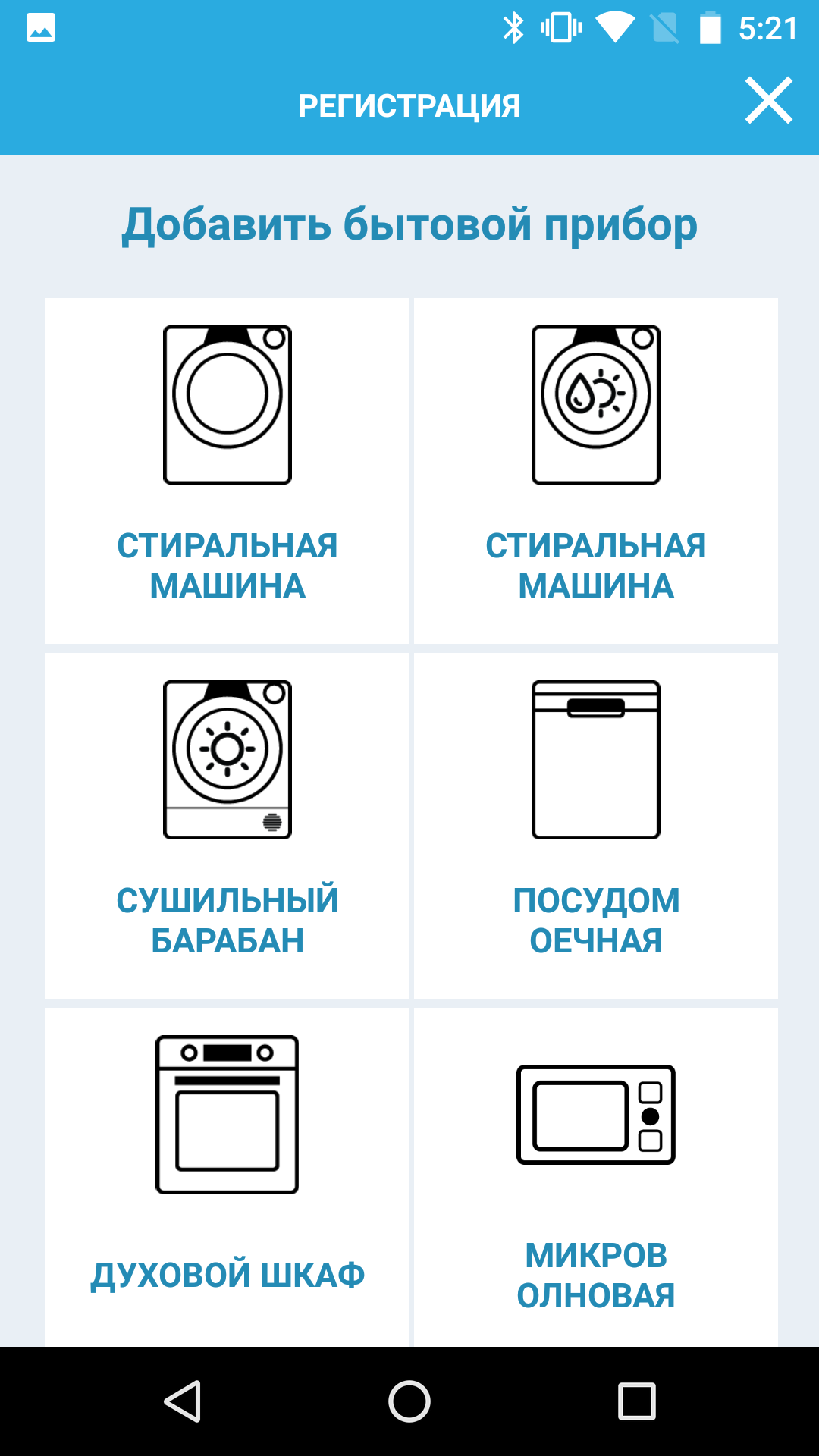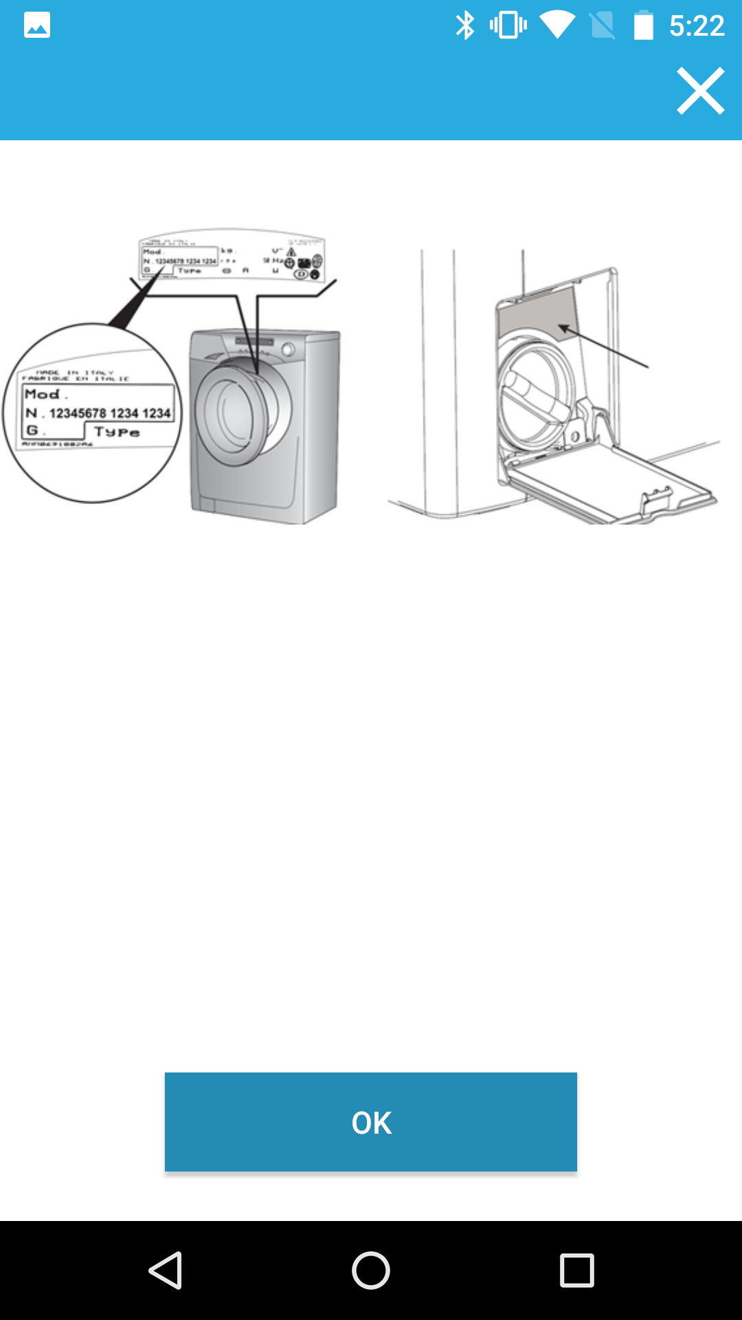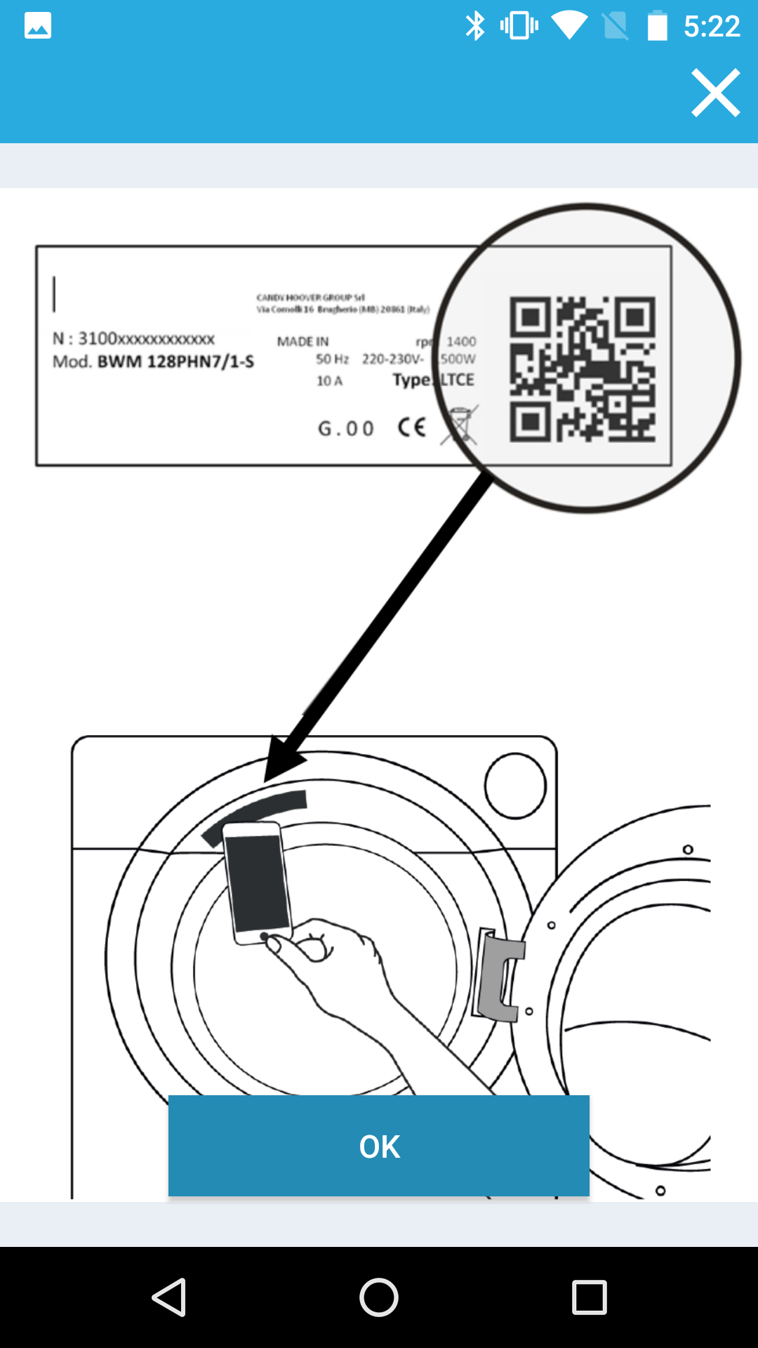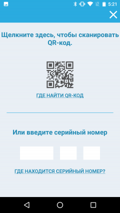 После активации аккаунта приложение предлагает добавить новый прибор. В нашем случае это стиральная машина без сушки (первый пункт). После выбора устройства нужно ввести дату покупки и серийный номер, который можно указать двумя способами: через фотографию QR-кода на крышке барабана (для машин с горизонтальной загрузкой) или, как в нашем случае, ручным набором номера с наклейки, расположенной над пробкой фильтра.