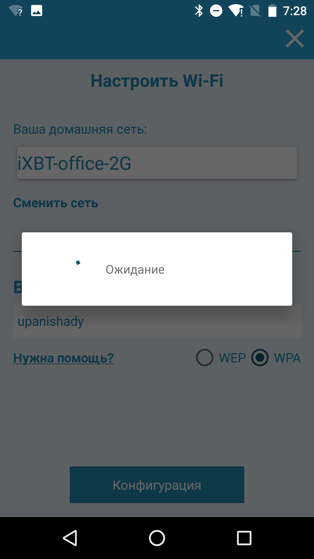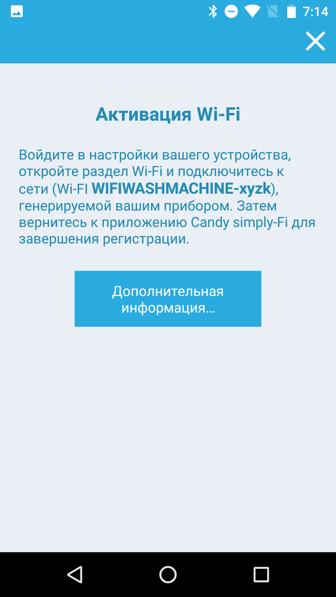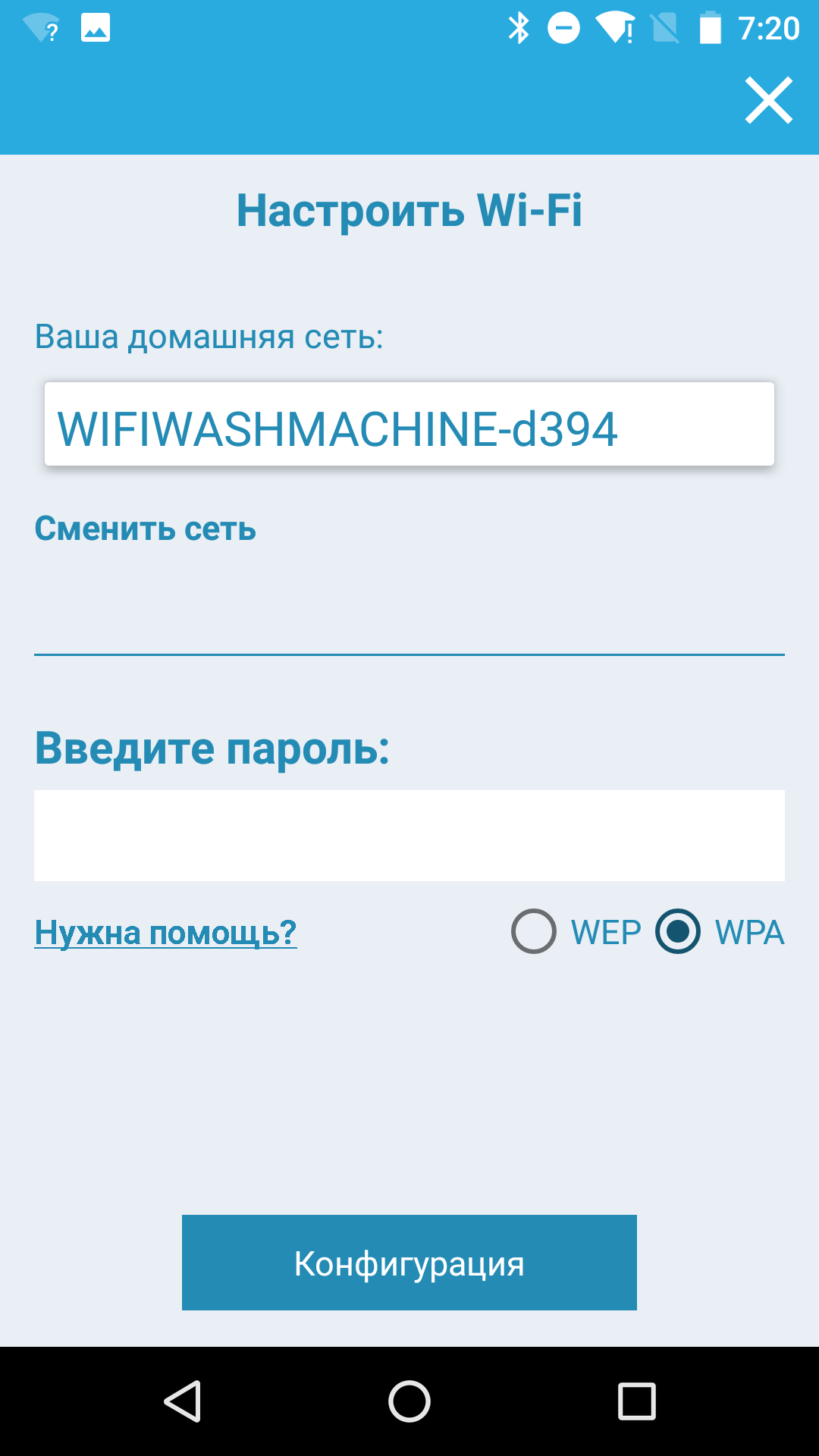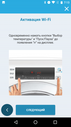 На этом этапе мы столкнулись с проблемой. При включении функции Wi-Fi стиральная машина создает собственную сеть с SSID «WIFIWASHMACHINE-<случайное буквосочетание>», и приложение должно подключиться к ней для настройки прибора. Однако при попытке подключения к свежесозданной сетке программа требует доступа к интернету, которого у стиральной машины еще нет. Такую коллизию разработчики почему-то не предусмотрели, и приложение в этот момент аварийно завершается.