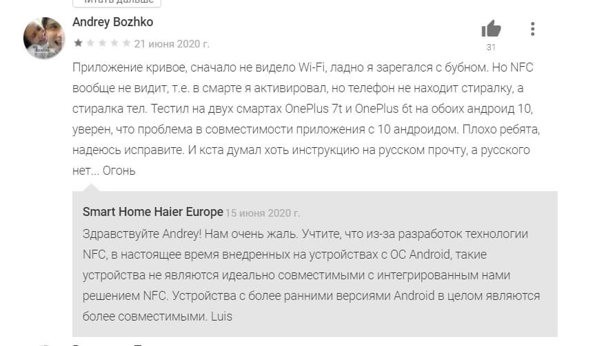 Согласно инструкции по эксплуатации, управлять прибором можно двумя способами: через Wi-Fi или при помощи NFC. Однако воспользоваться функцией NFC у нас не получилось: используемый при тесте Google Pixel 2 c Android 10 так и не сумел связаться с беспроводным интерфейсом стиральной машины. Разработчику приложения известно о проблеме совместимости с десятой версией этой операционной системы, но на момент написания материала она не решена.