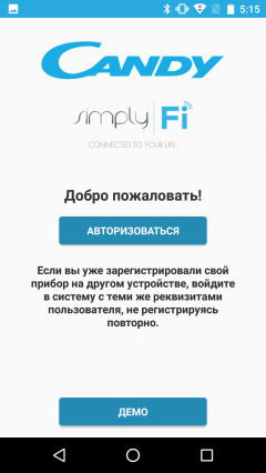 Для управления стиральной машиной пользователю смартфонов с Android предлагается скачать приложение Candy simply-Fi. Аналогичное приложение существует и в AppStore, но у него ограниченная функциональность (производитель, вероятно, полагает, что поклонники устройств Apple не входят в целевую аудиторию фирмы), и в нашем обзоре оно не рассматривалось.
