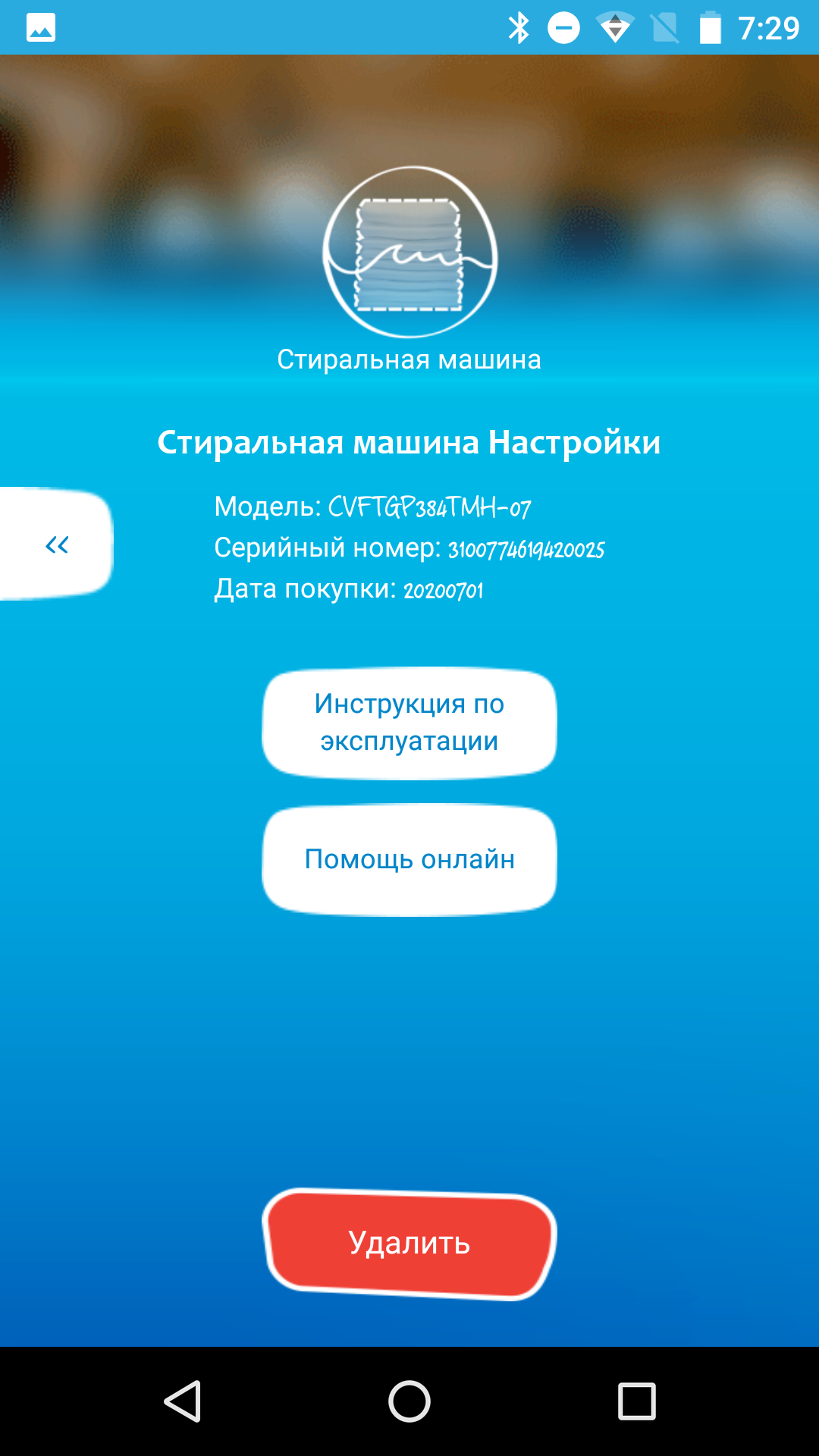 Раздел «Настройки» невелик: тут можно увидеть информацию о введенных ранее серийном номере машины и дате покупки, а также ссылки на размещенные на сайте производителя инструкцию по эксплуатации и форму обратной связи.