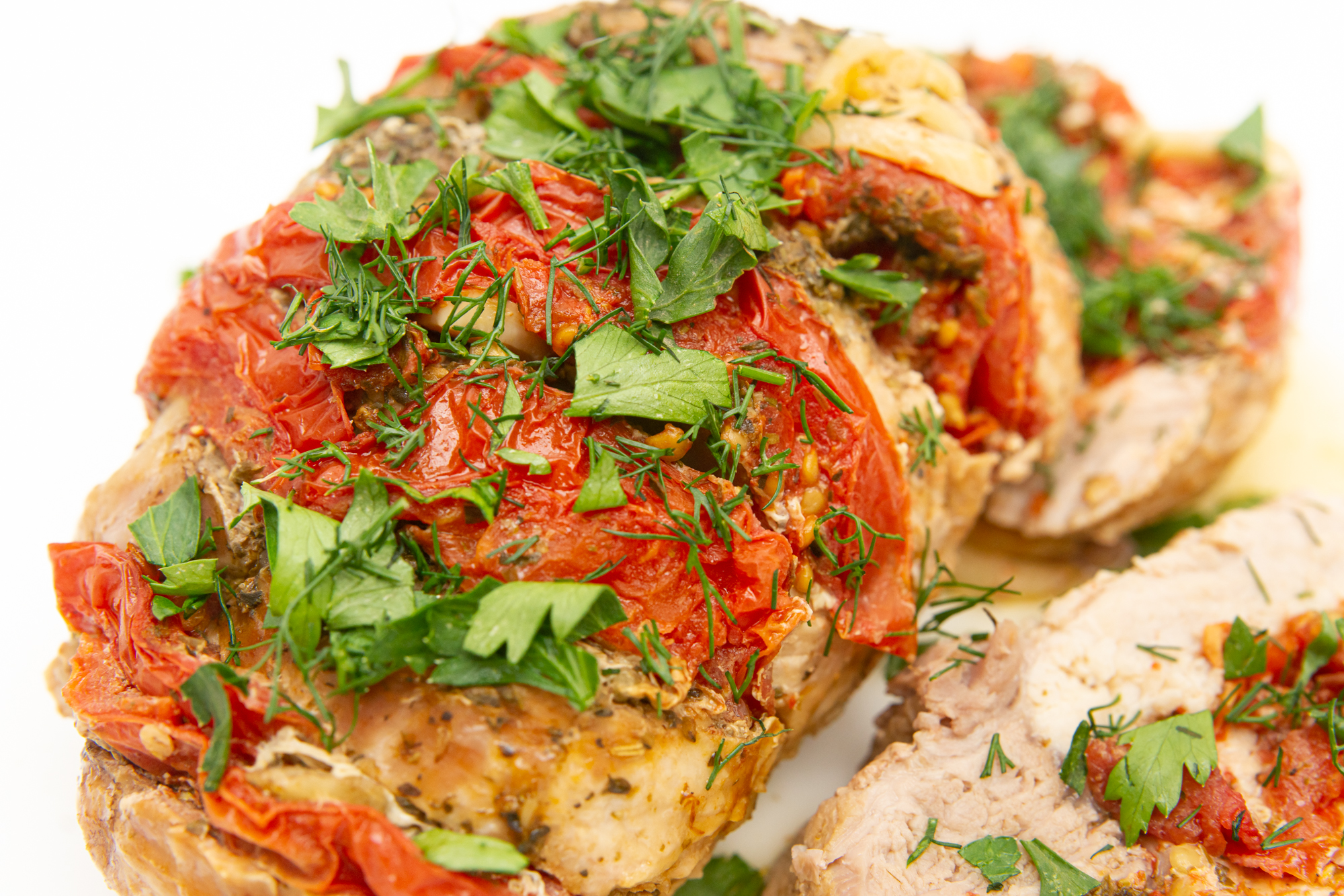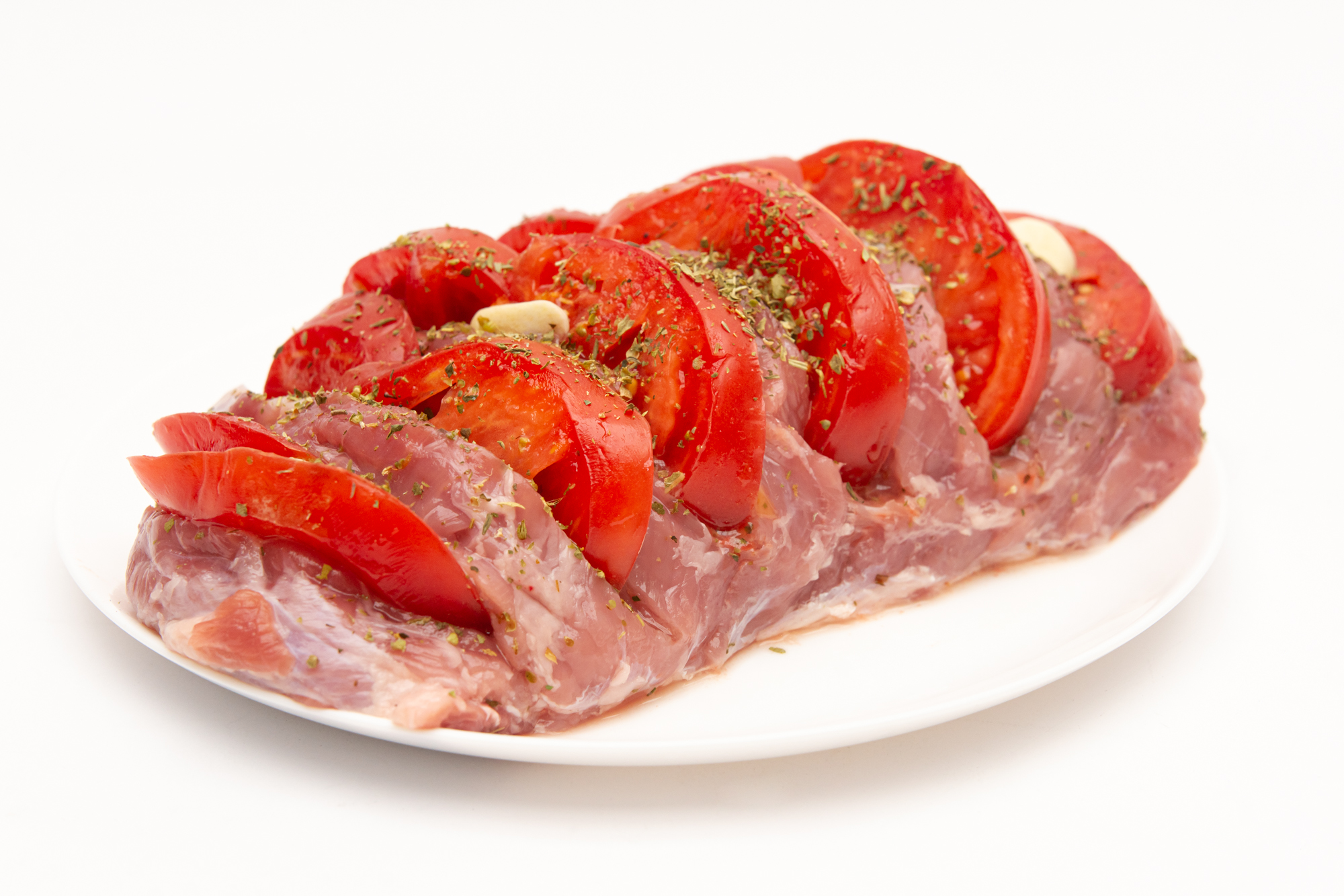 В мясе сделали надрезы (по размеру порционных кусков), чеснок и помидоры нарезали кружочками. На противень положили фольгу, смазали маслом, посыпали пряностями (предпочтительнее брать смесь трав, содержащую базилик, розмарин и тимьян) и солью, сверху выложили мясо. В надрезы вставили кружочки помидоров и чеснока. Посолили, поперчили и присыпали травами.