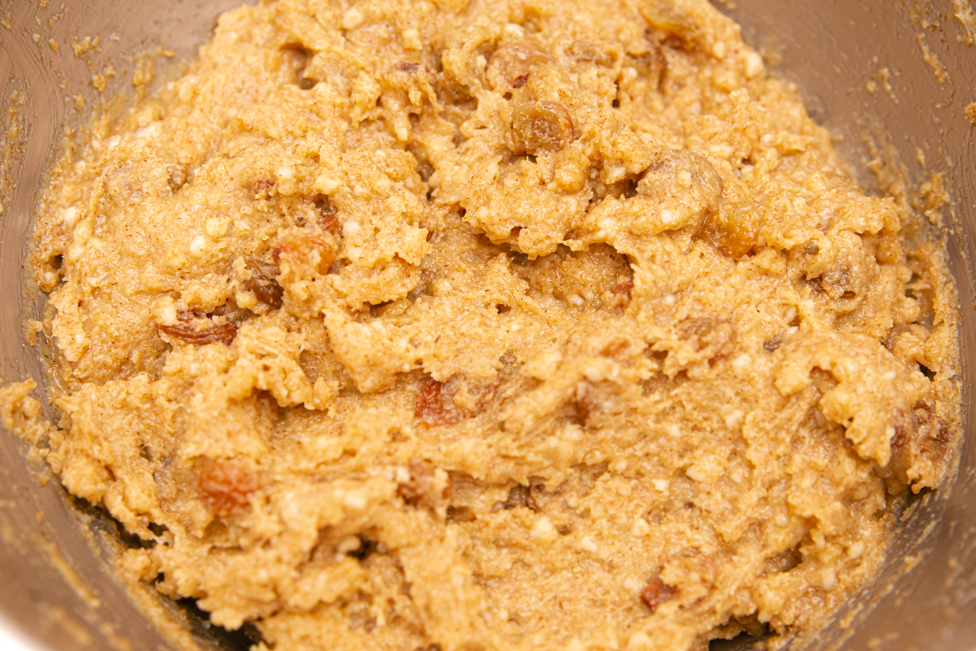 Размягченное сливочное масло взбили с сахаром, затем добавили яйца и взбили еще раз. Всыпали в масляно-сахарную смесь просеянную цельнозерновую муку, щепотку соли, измельченный арахис, изюм и перемешали. Тесто получилось достаточно плотным.