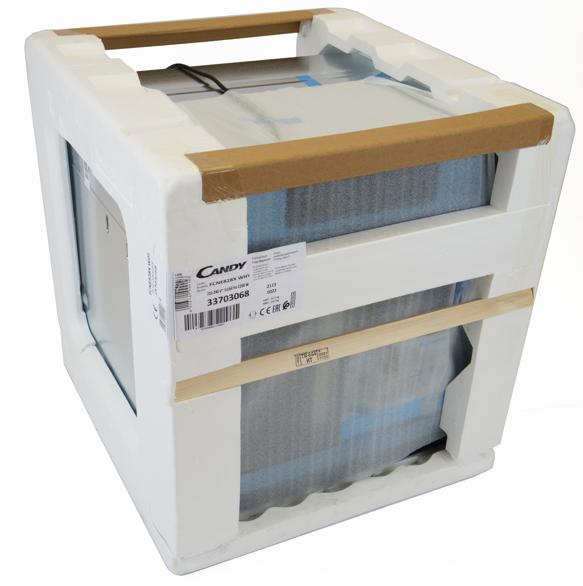 Прибор прибыл на тестирование в коробе из пенопласта, с деревянными вставками по центру. Стеклянная дверь духовки была обернута вспененным полиэтиленом. На упаковке — стикер с информацией о модели.
