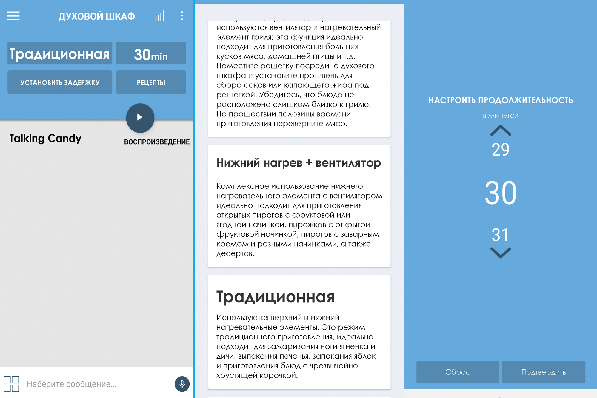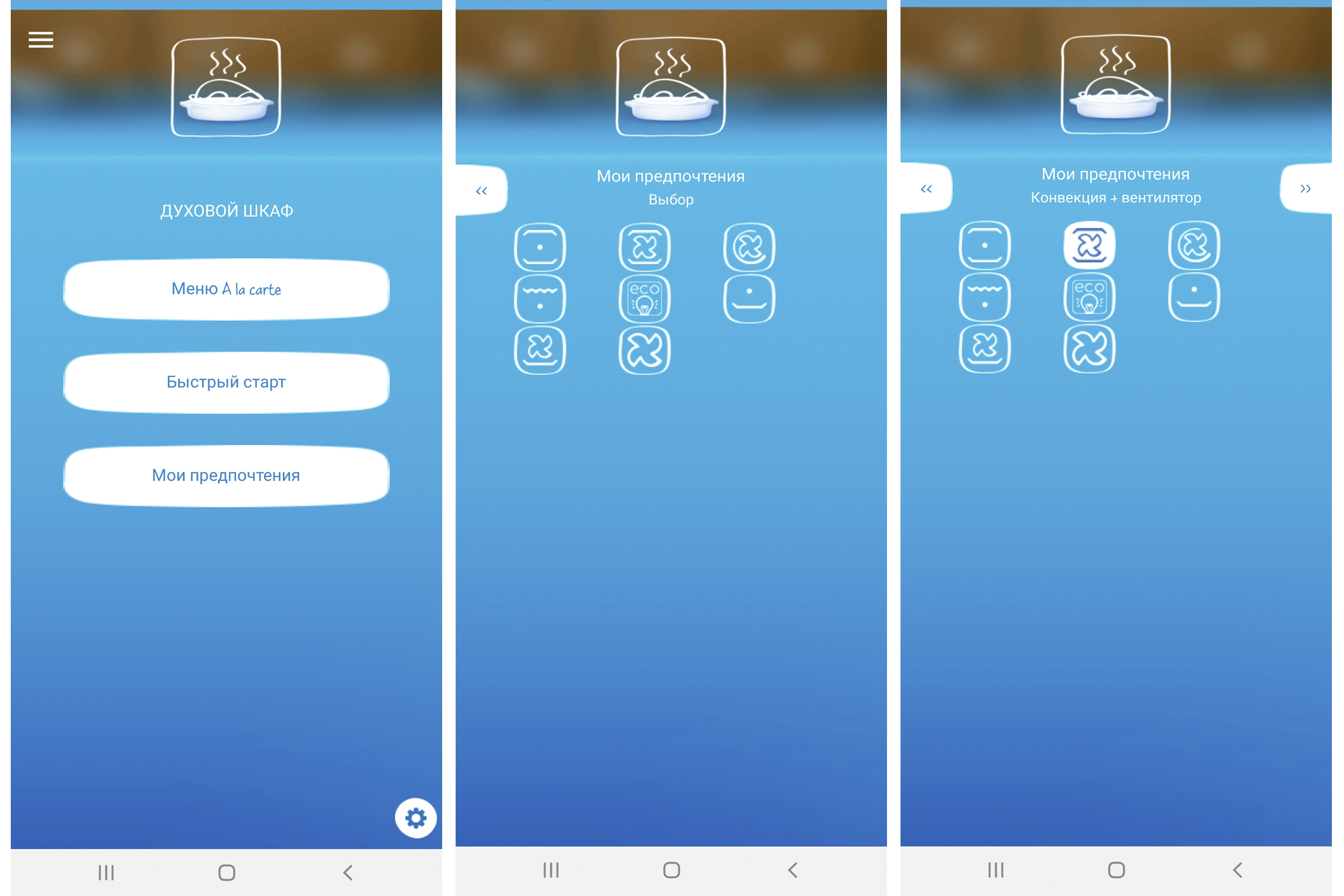 Начинка меню реального пользователя несколько отличается от демо версии. Рецептов и функции запуска «беседы» с духовкой здесь не оказалось.