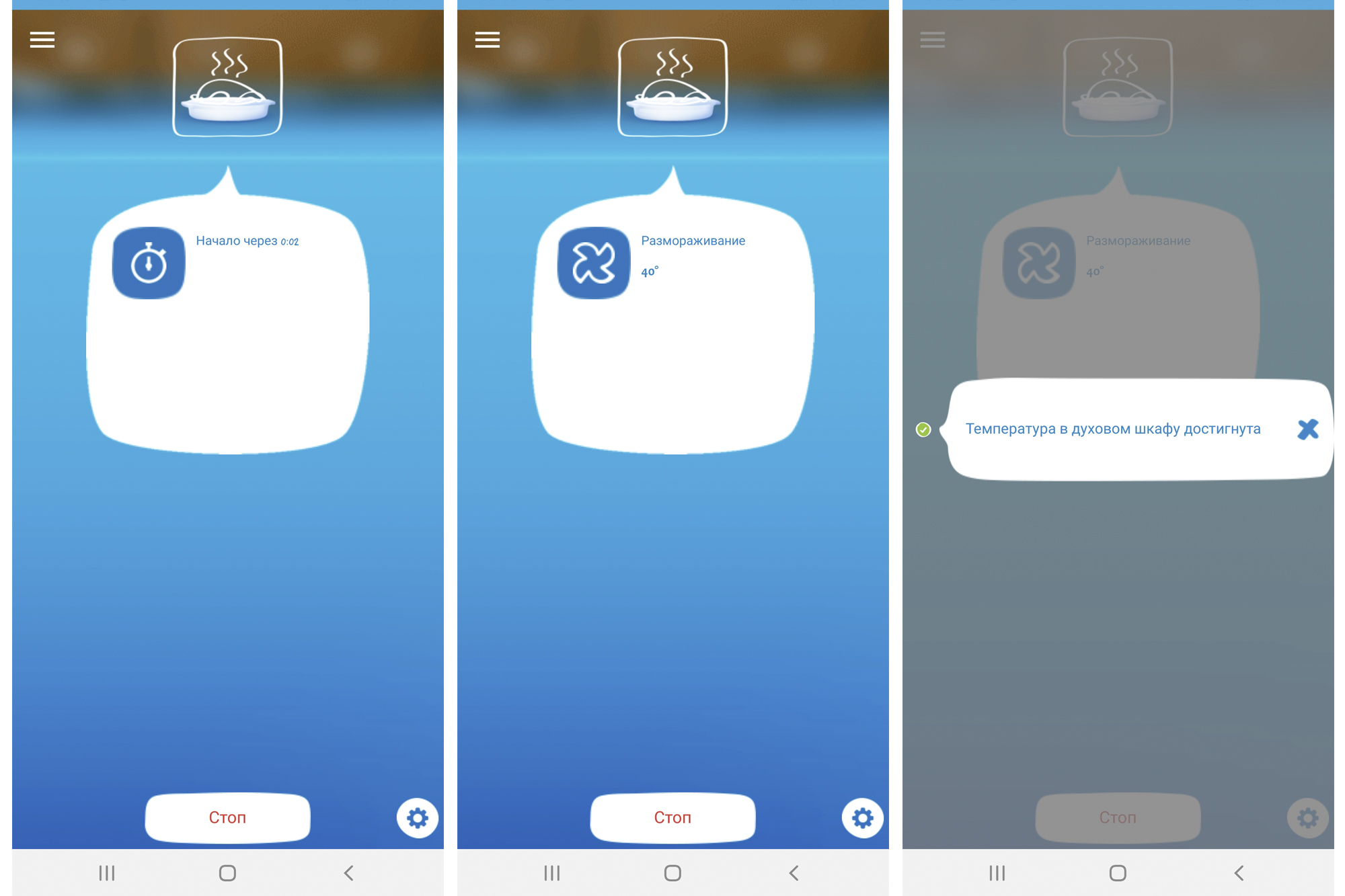 По окончании программы духовка издает звуковой сигнал, а приложение отправляет сообщение на экран смартфона.