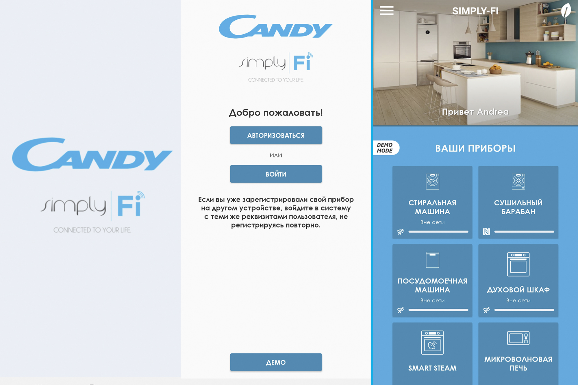 Помимо традиционного способа, управление духовым шкафом осуществляется также, с помощью приложения simply-Fi, универсального для всех управляемых со смартфона устройств Candy. Есть возможность запустить демо версию без регистрации и посмотреть как все устроено, изнутри, еще до установки нового прибора.