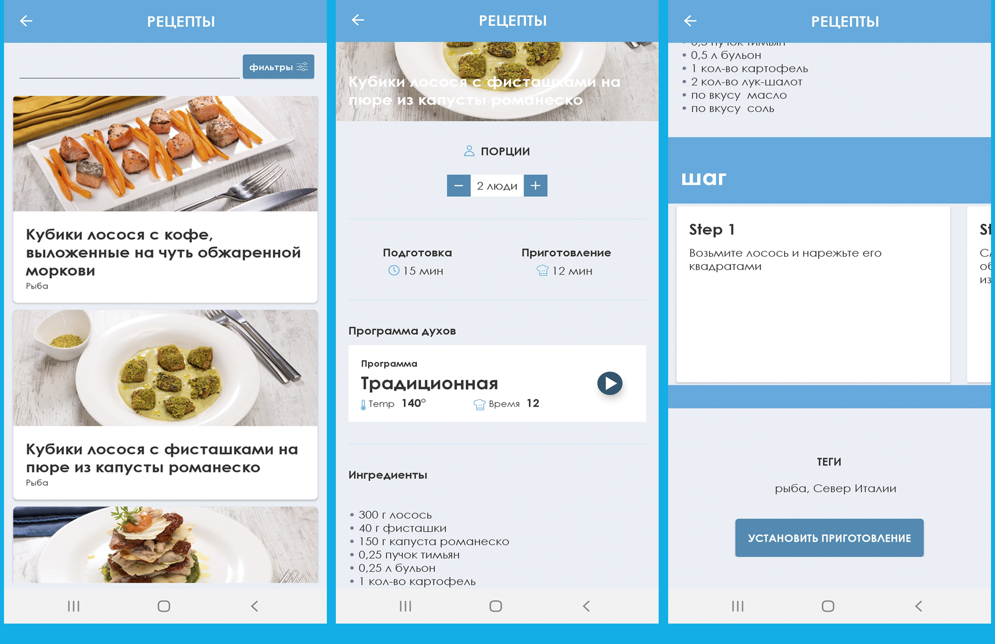 Нажав на кнопку «Рецепты», мы переходим к списку рецептов с рекомендациями по приготовлению, включающими в себя время, температуру и список необходимых ингредиентов.