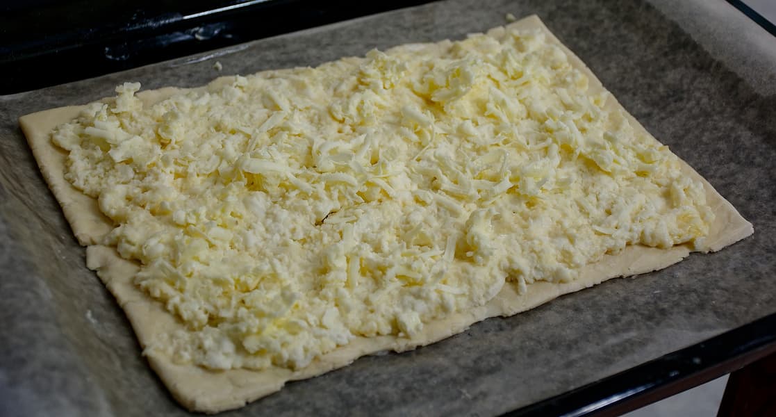 Начали мы с «ленивого» пирога из готового слоеного теста. Стандартный пласт размороженного теста растянули руками в прямоугольник, натерли на крупной терке примерно 400 граммов моцареллы, которую немного посолили и смешали с парой зубчиков чеснока. Сверху на сырную начинку натерли немного сливочного масла.