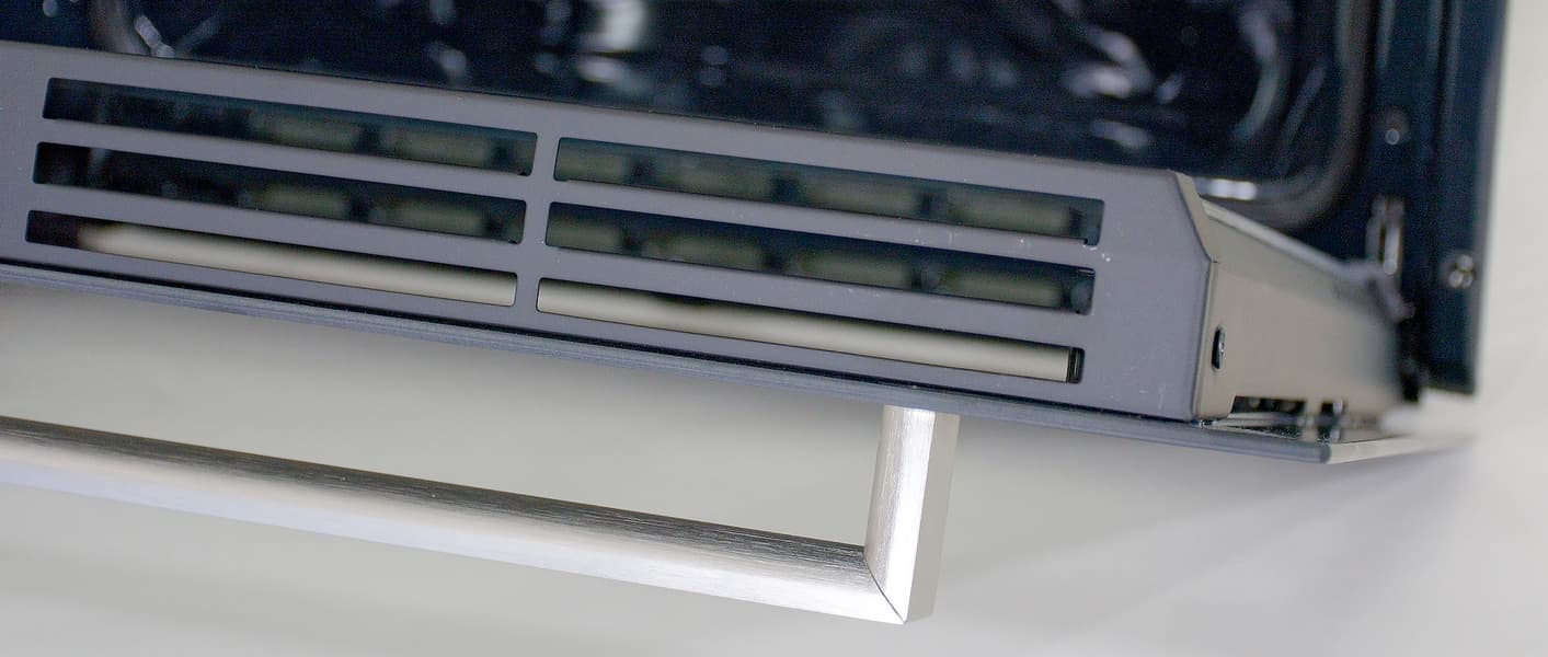 Верхняя часть в центре — это электронный блок управления с крупными утапливаемыми круглыми ручками по бокам. Нижняя часть — дверца с большим стеклом и большая удобная ручка. Поворотные переключатели, ручка и логотип производителя приятного стального цвета, в целом гармонично и взгляд радует.