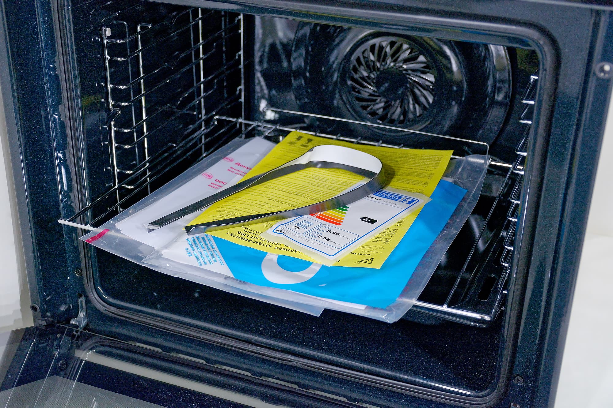 Внутри коробки находилась сама Candy FCP615NXL, а внутри духовки обнаружилась документация, необходимые для встраивания саморезы, уплотнительная резинка, противень и решетка.