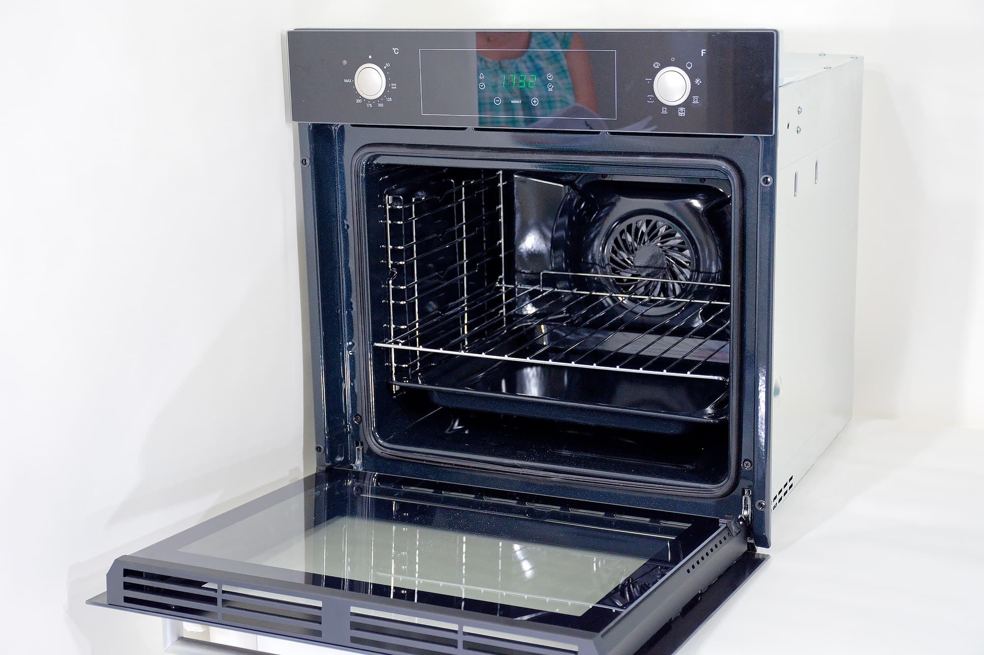 Основы управления интуитивно понятны с первого взгляда. Правая поворотная ручка отвечает за выбор режима, левой выставляется температура нагрева. Крутится все легко и тактильно приятно. Ручки можно утапливать в поверхность духовки, чтобы они не торчали.