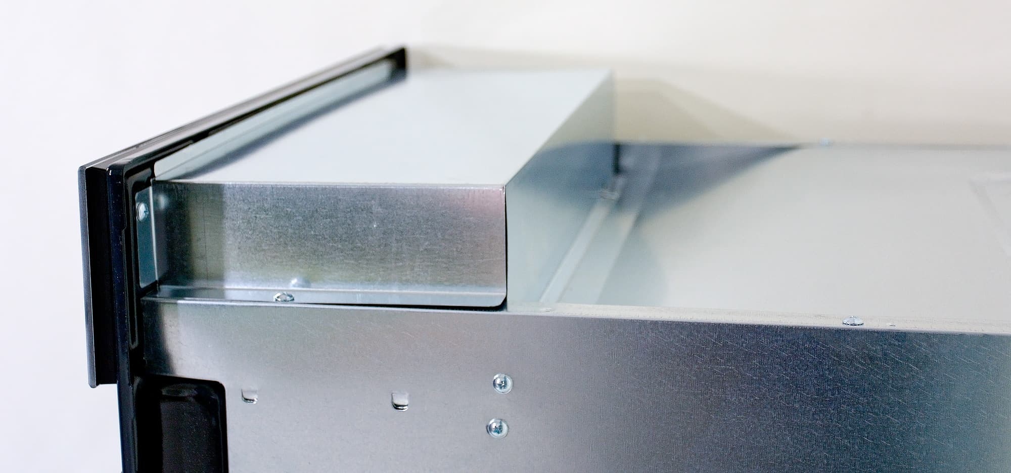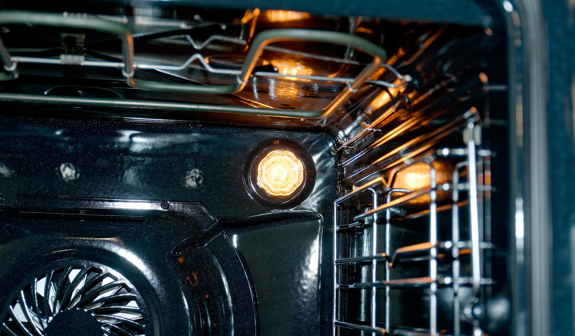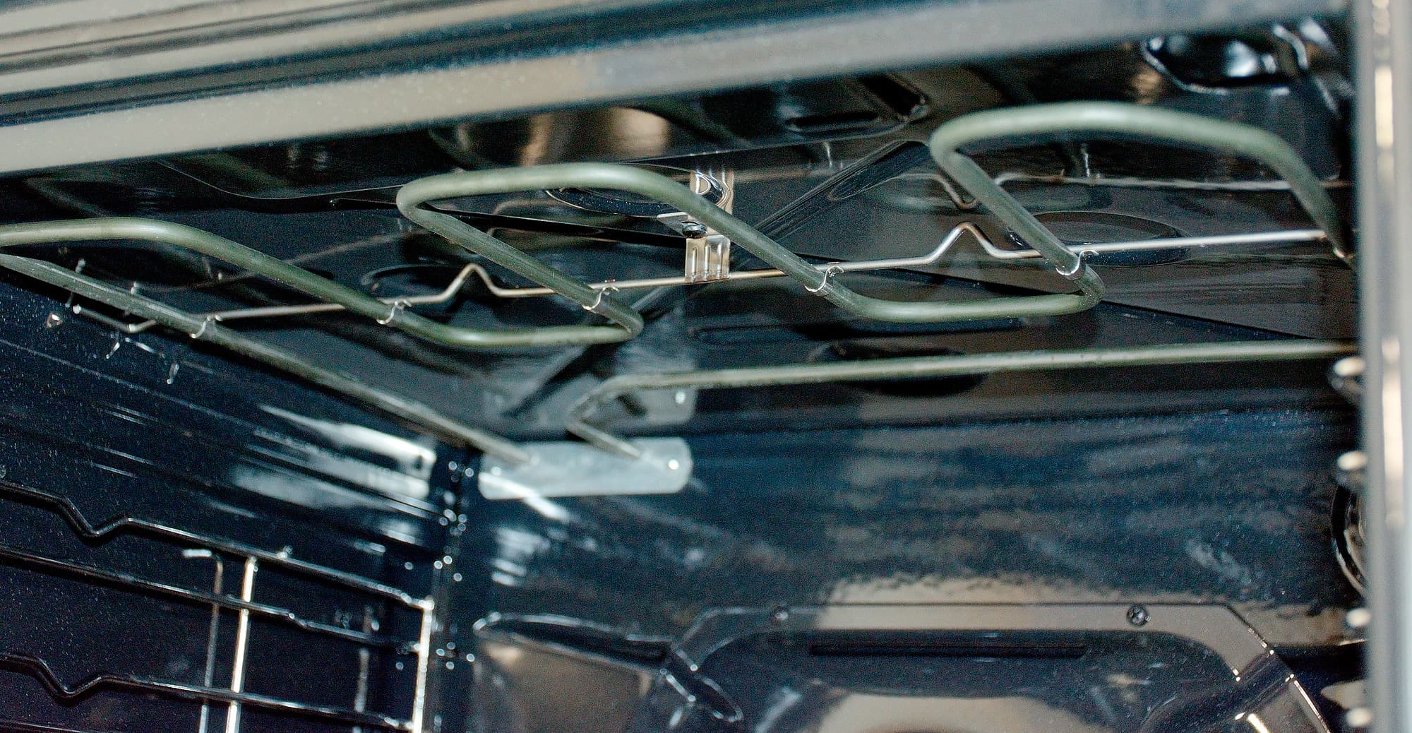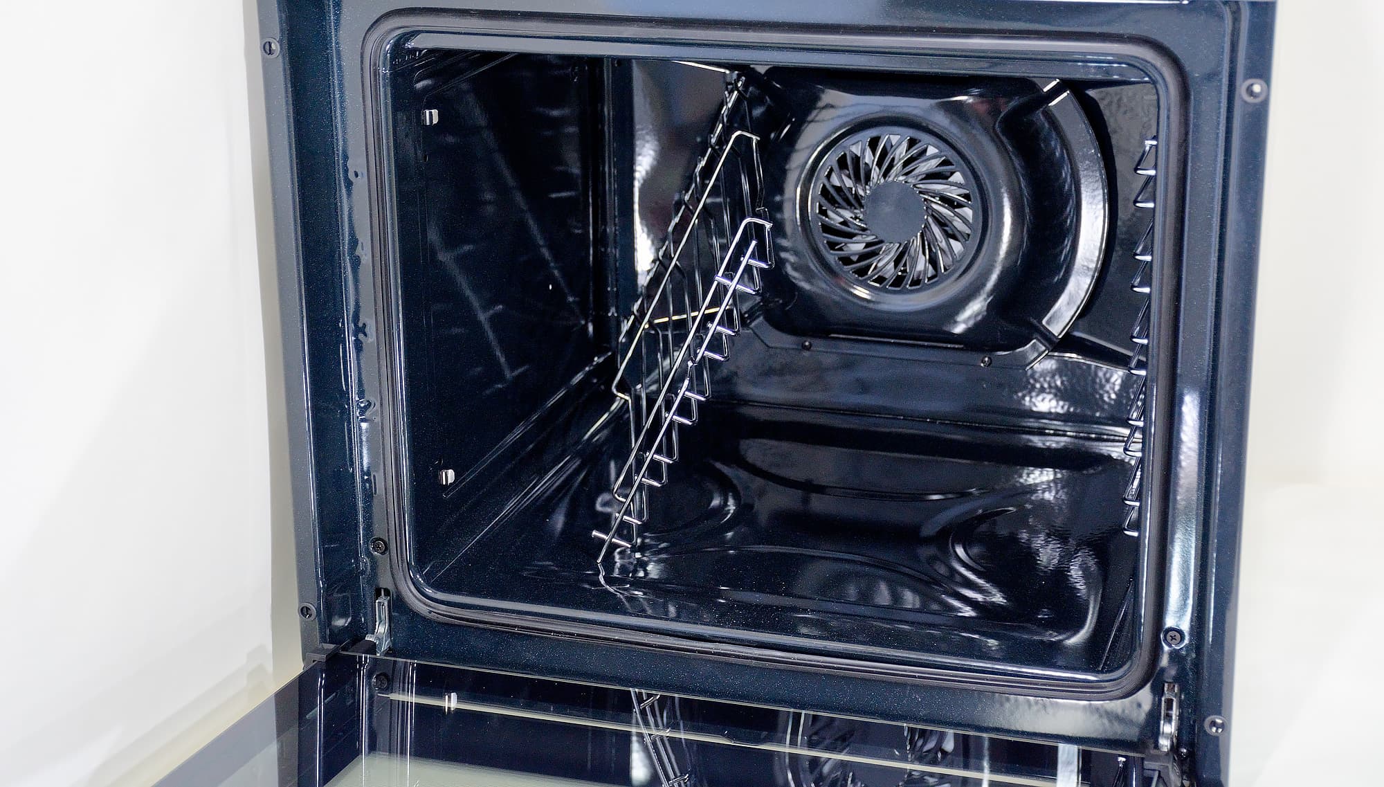 Внутри — все вполне ожидаемо: черная эмалированная емкость с тэном гриля сверху и вентилятором конвекции, скрытом за решеткой задней стенки, по бокам — металлические направляющие для противня. Можно их снять (например, чтобы вымыть в посудомоечной машине).
