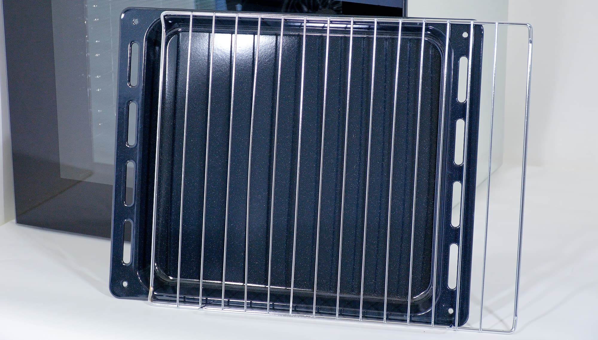 Толщина противня нас не очень впечатлила — он оказался таким тонким, что при первом нагреве даже изогнулся, стоя в духовке. Впрочем, далее все прошло нормально. То же повторилось и с решеткой: при первом нагреве два прута искривились, затем выпрямились и дальше хлопот не доставляли.
