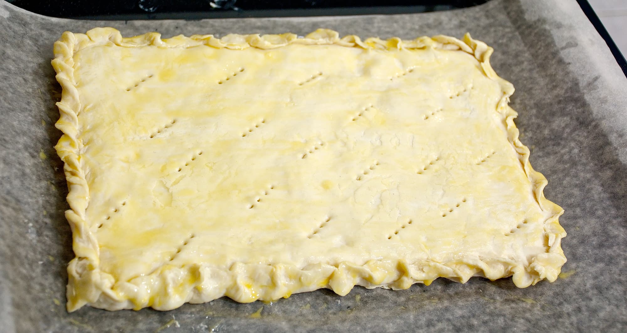 Затем раскатали второй кусок теста, поместили его сверху. Полученное изделие защипнули по краям, смазали желтком и прокололи в нескольких местах с помощью вилки.