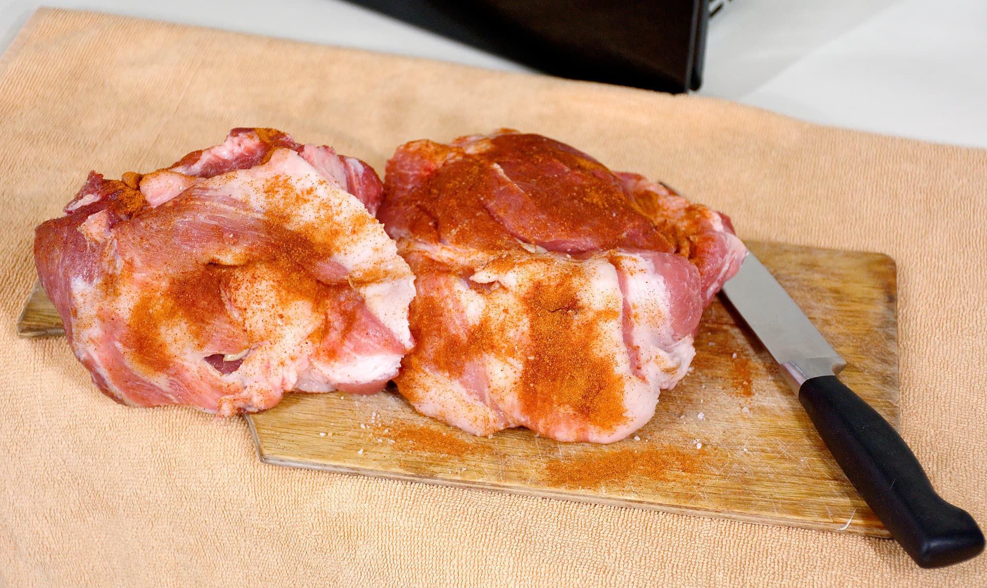 В этом тесте мы запекаем простейшую версию мяса. 2 куска свиной шеи по килограмму каждый нашпиговали чесноком, посолили и посыпали чайной ложкой острого красного перца и столовой — молотой копченой паприки.