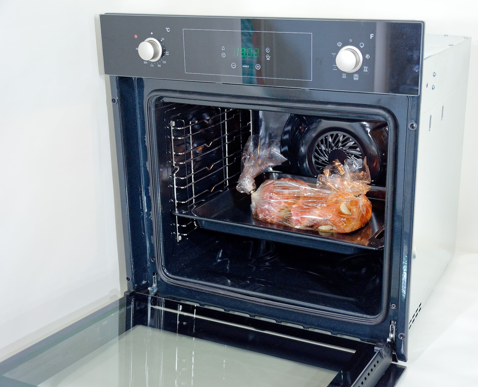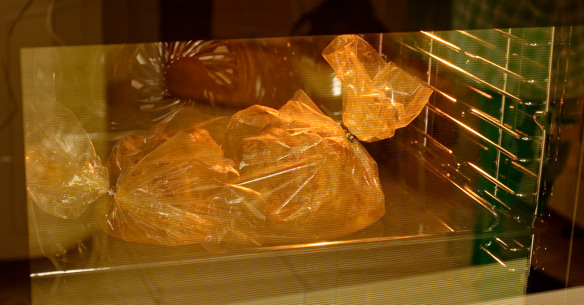 Сложили полученное в пакет для запекания и защепили края прилагающимися к пакету клипсами. Выставили режим верхнего и нижнего нагрева и температуру на значение 175 (на самом деле, как теперь уже мы знаем, она будет выше номинала). Пакет прокололи в нескольких местах, чтобы выходил горячий воздух, и поместили в нашу тестируемую.