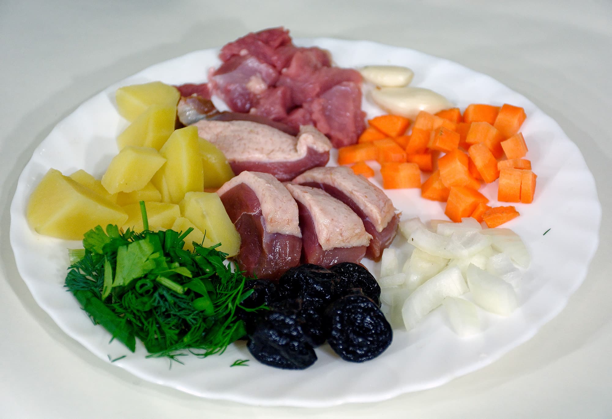 Продолжаем экспериментировать. Мы взяли для каждого горшочка примерно такой набор продуктов, как на фото: филе утиной грудки и бедра индейки, немного лука и морковки, немного картошки, зелень, пару зубчиков чеснока и несколько черносливин. Картошку для ускорения процесса сначала на три минуты поместили в микроволновку.