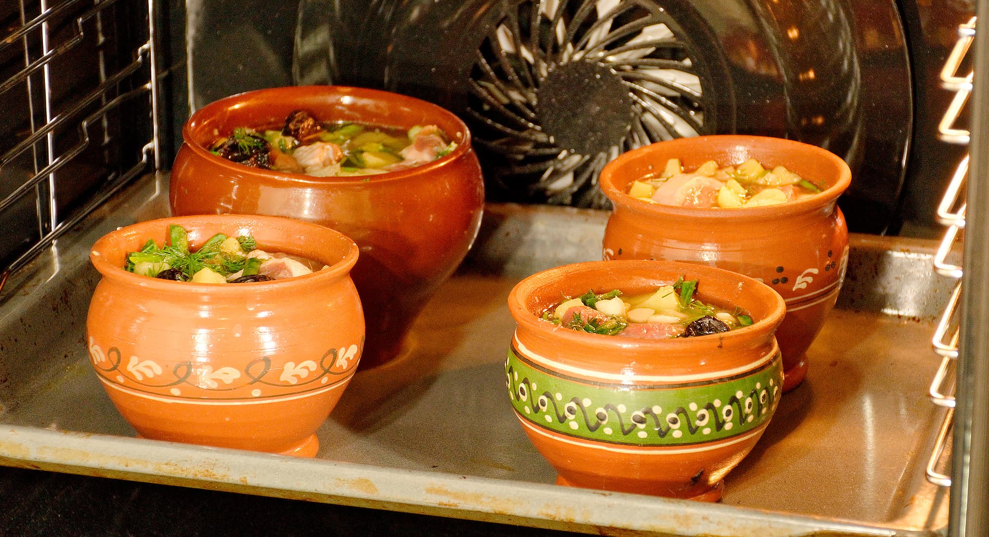Ингредиенты разложили по разномастным горшкам, добавили соли, перца и немного воды.