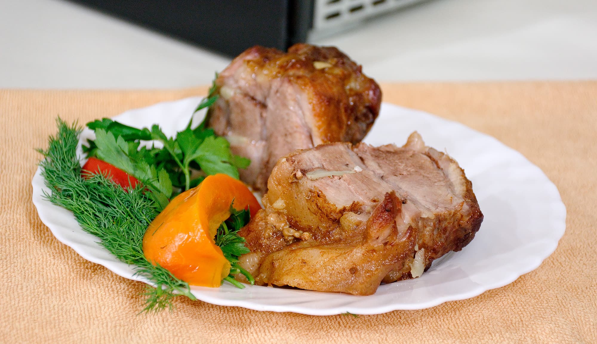 Еще через 10 минут достали свинину из духовки.