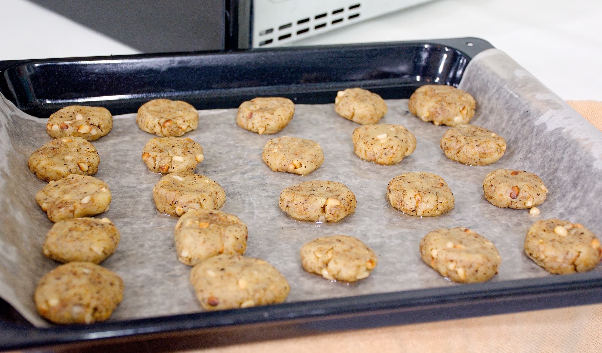 Затем вручную скатали кусочки теста в шарики, а те приплющили и разложили по противню. Бумага для выпечки попалась незнакомого сорта, поэтому ее предварительно смазали маслом.