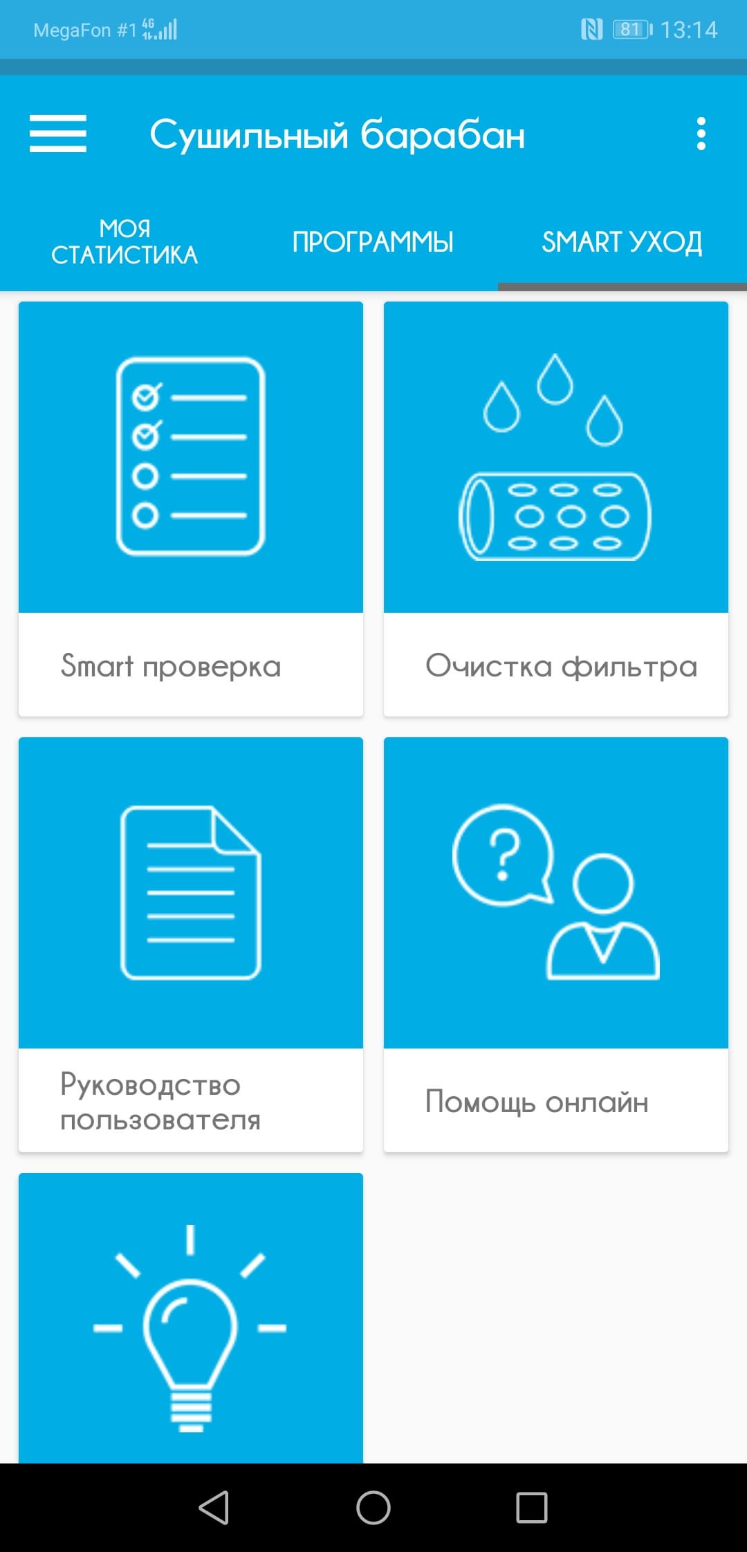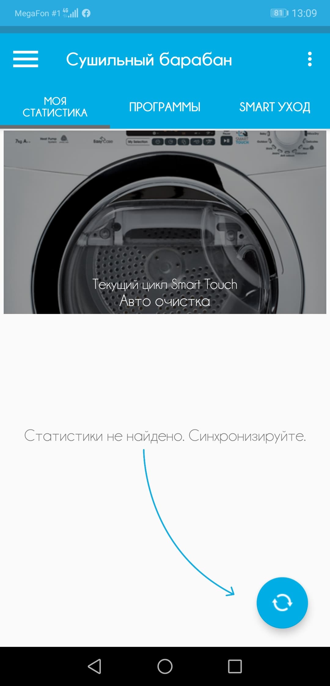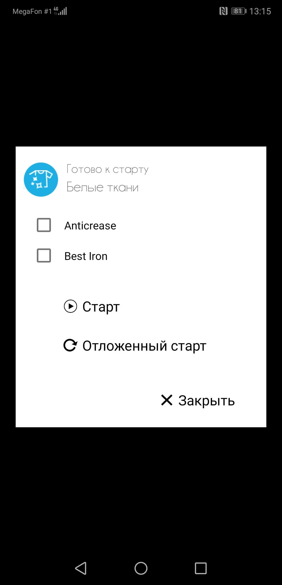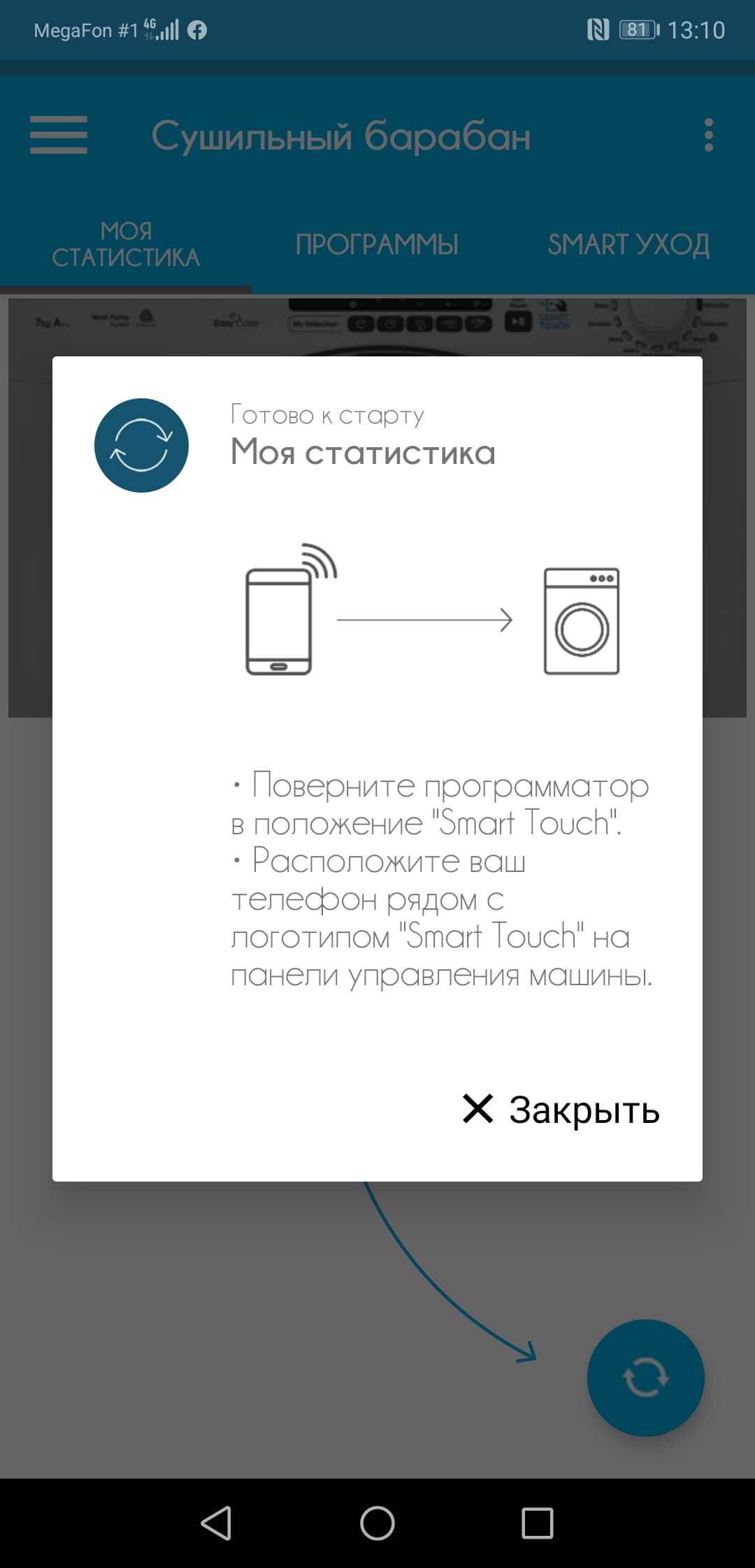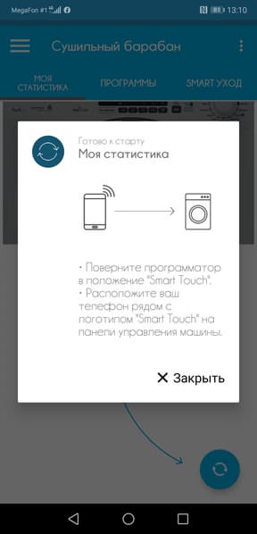 Тап на программе выводит окно запуска (кстати, почему-то снова не переведенное до конца). Достаточно тапнуть на «Старт», поднести смартфон к надписи «Smart Touch» на корпусе сушилки — и программа запустится.