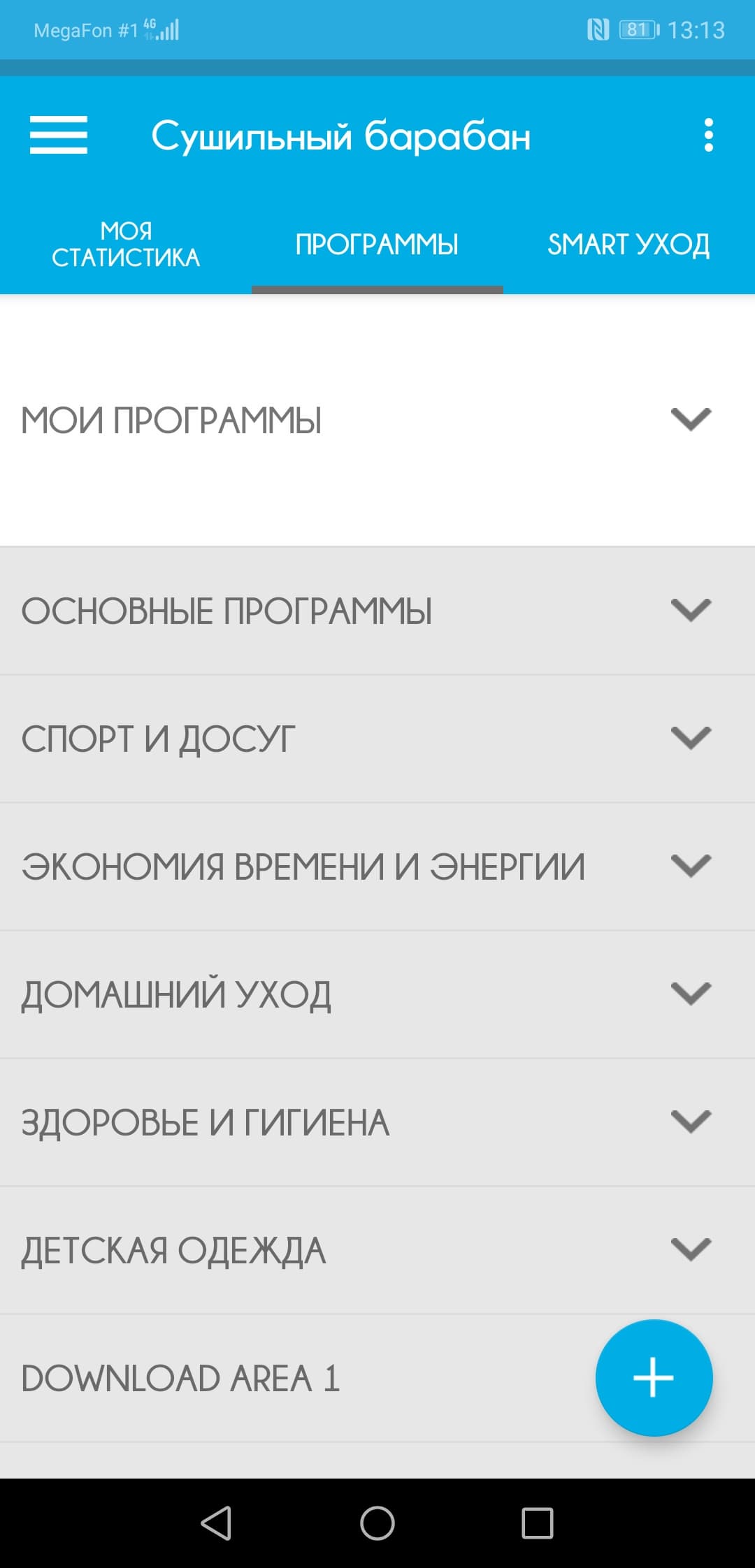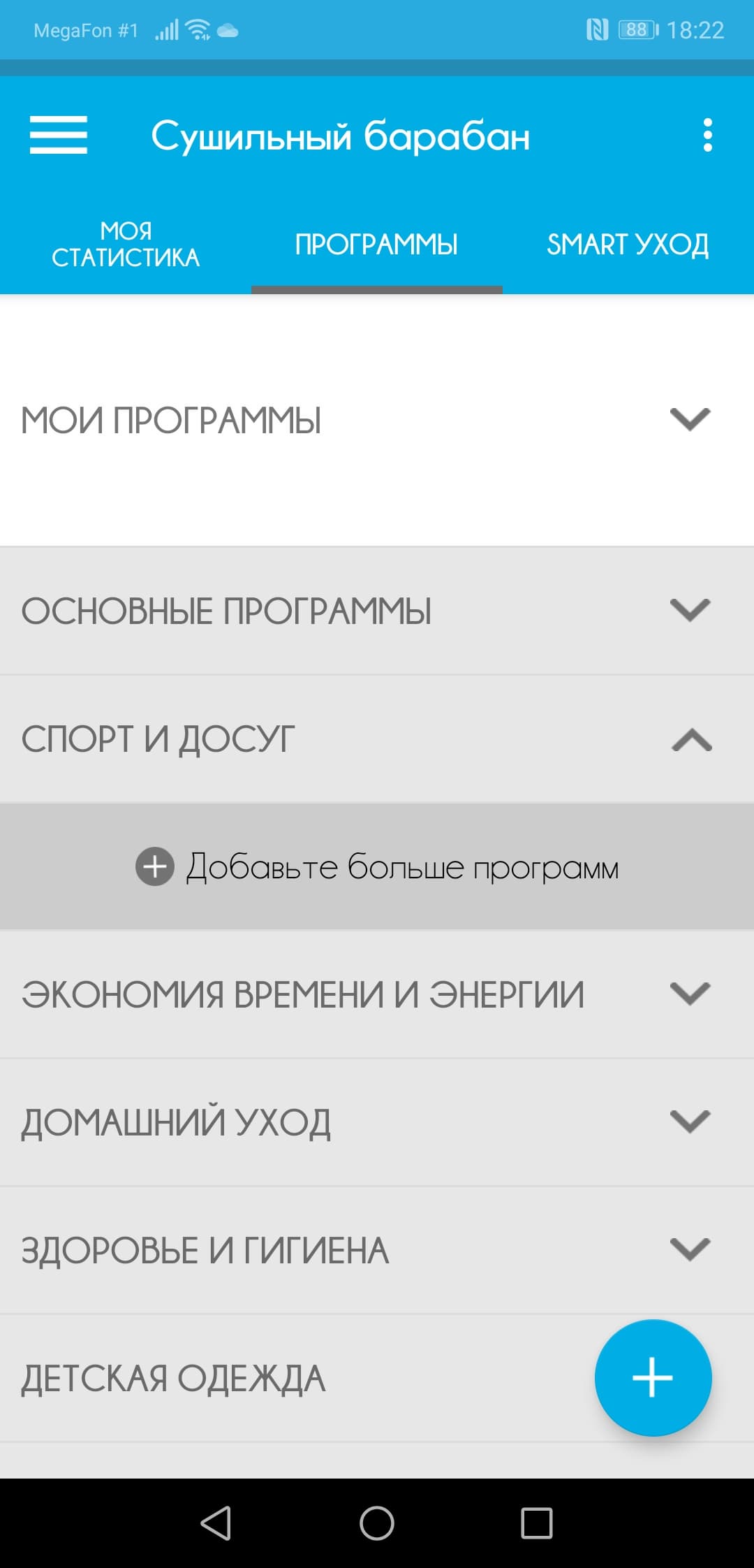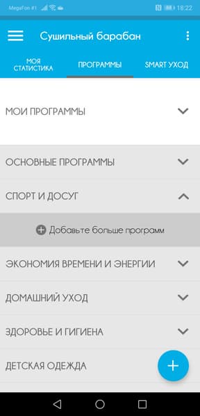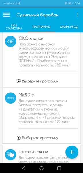 Поворотный селектор программ позволяет выбрать одну из 14 программ, переключить сушильную машину в режим управления со смартфона или просто выключить ее. Все программы имеют понятные названия, кроме не переведенной с английского «Mix & Dry» и «Эко-хлопка» (в чем здесь «эко»?) Ответ на последний вопрос прост: эта программа дублирует обычный «Хлопок», но при этом экономит электроэнергию. Ну а «Mix & Dry» — это в переводе на разговорный язык «высушить насухо мешанину из всего подряд», или, как сказал один из наших обозревателей «программа для холостяка».