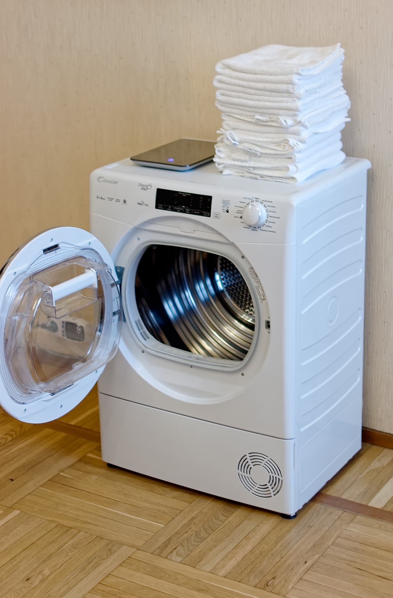 Скорее всего, это свойственно всем сушильным машинам, но как общавшиеся до этого только со стиральными и комбинированными, мы отметили, что сушилка стоит совершенно недвижимо — хоть хрустальную вазу сверху ставь.