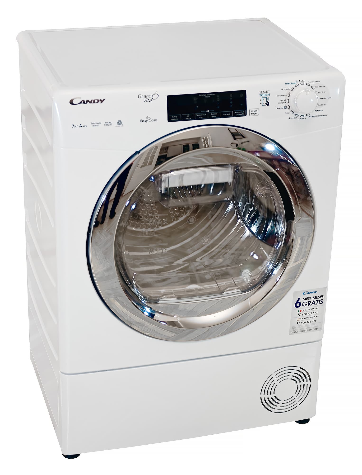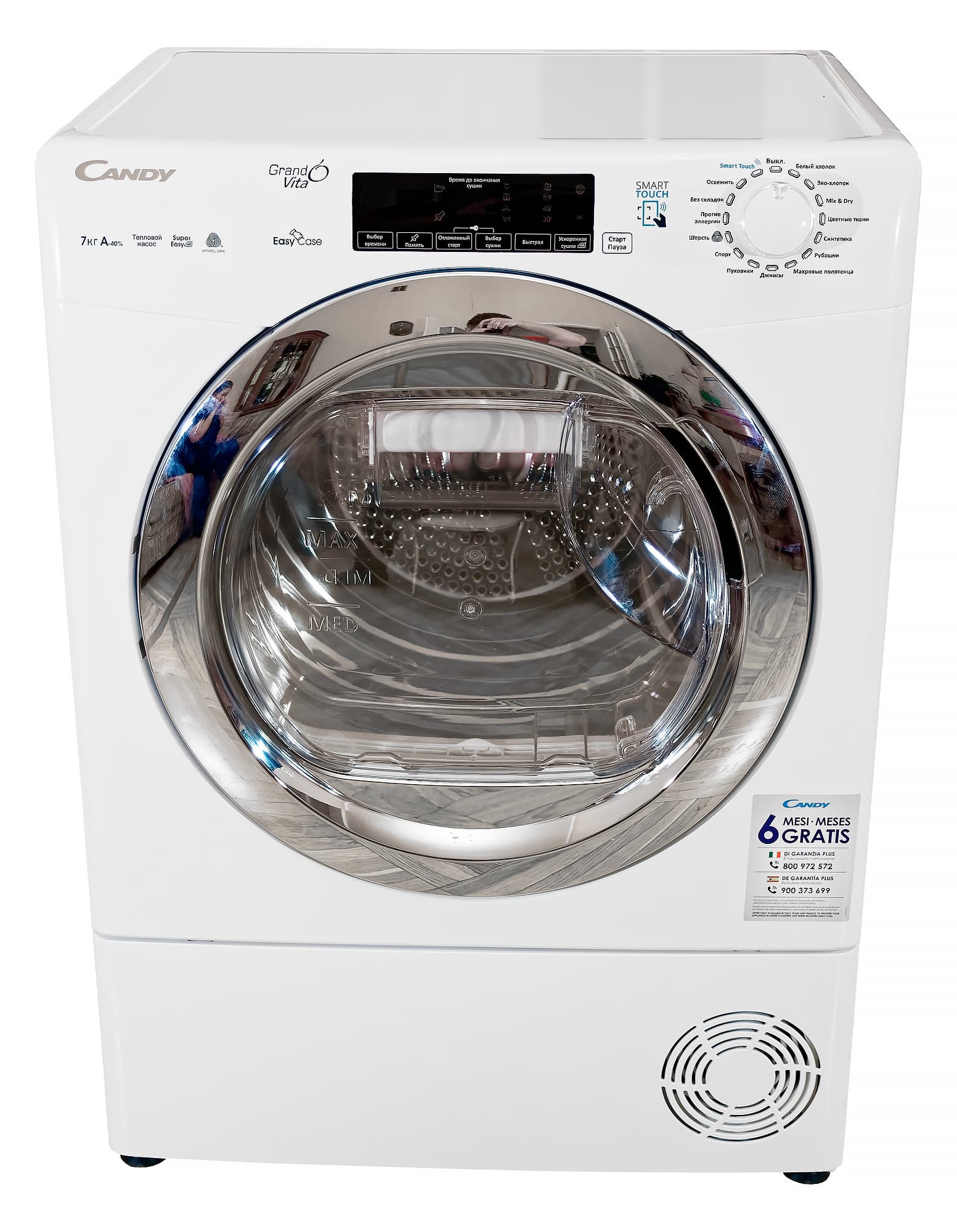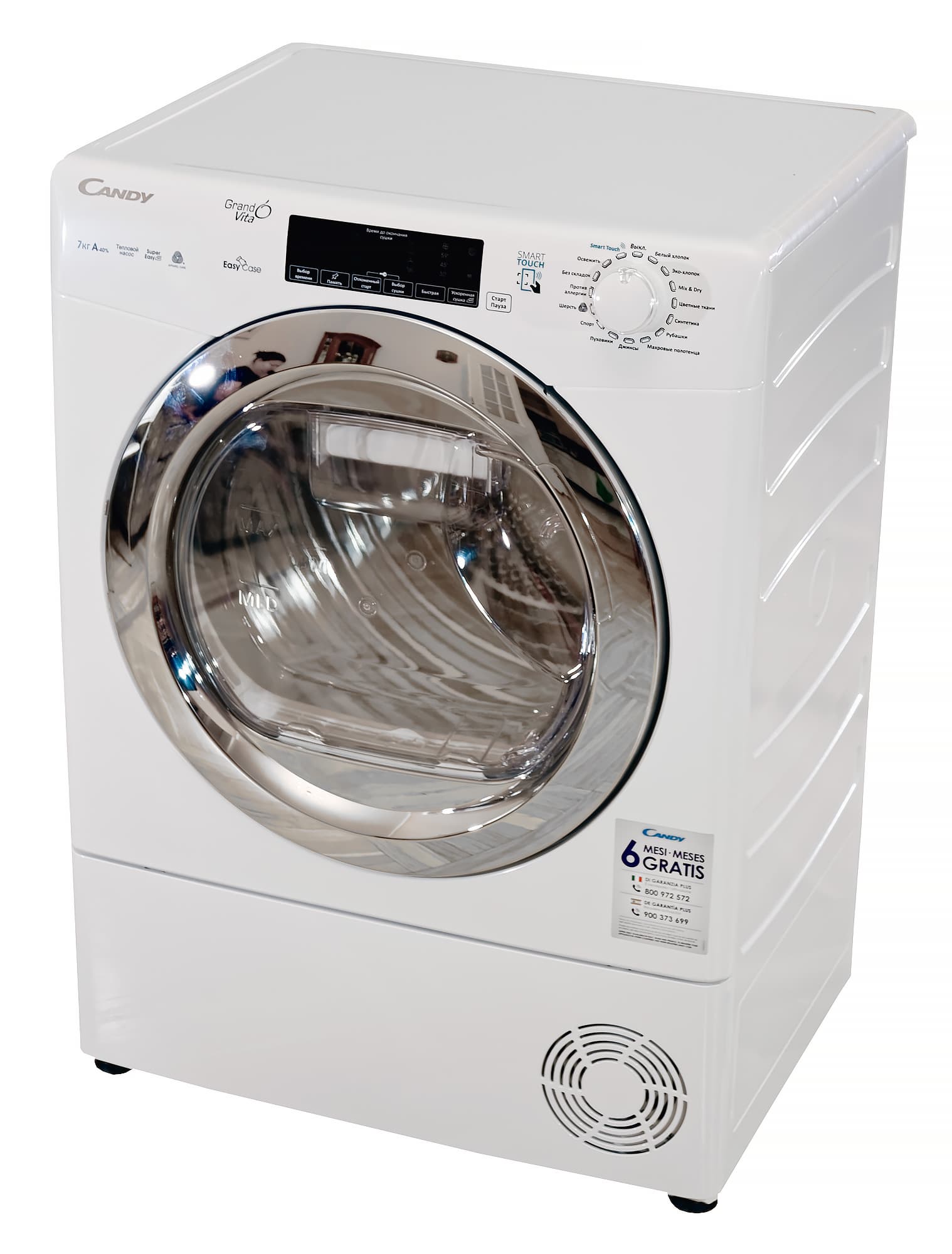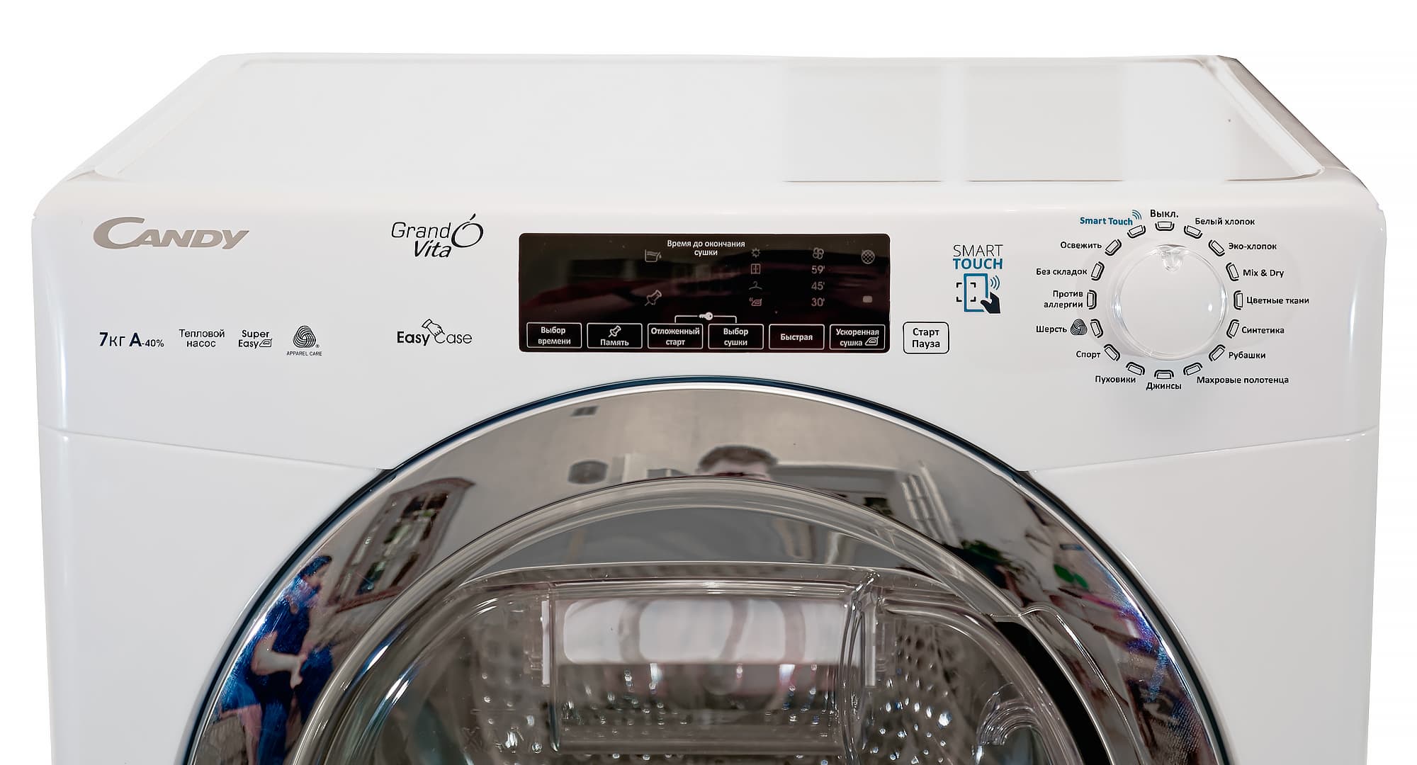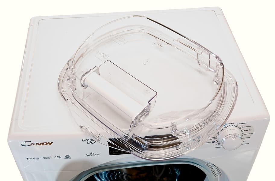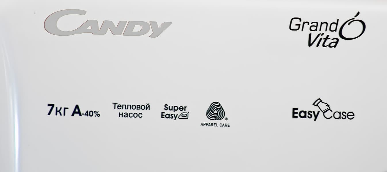 Героиня сегодняшней статьи имеет бак объемом 99 литров и способна высушить за раз 7 кг хлопка. По крайней мере, так считает ее производитель. Внешне же Candy GVS4H7A1TCEX-07 выглядит точь-в-точь как отдельностоящая широкая стиральная машина глубиной 47 сантиметров. По словам Candy, это очень немного — как правило, сушильные машины такой вместительности глубже сантиметров на 10. Только как следует присмотревшись, можно заметить, что привычного выдвижного отсека для моющего средства в левой верхней части корпуса нет — там просто гладкая поверхность с разными надписями.