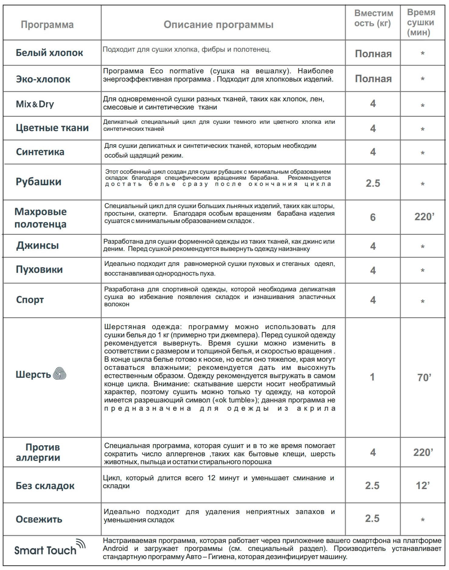 Из безусловно полезных сведений, с которыми будет небезынтересно ознакомиться даже перед покупкой сушильной машины, в инструкции приведена таблица с описанием всех режимов и некоторых их параметров. Мы просто приведем ее здесь полностью.
