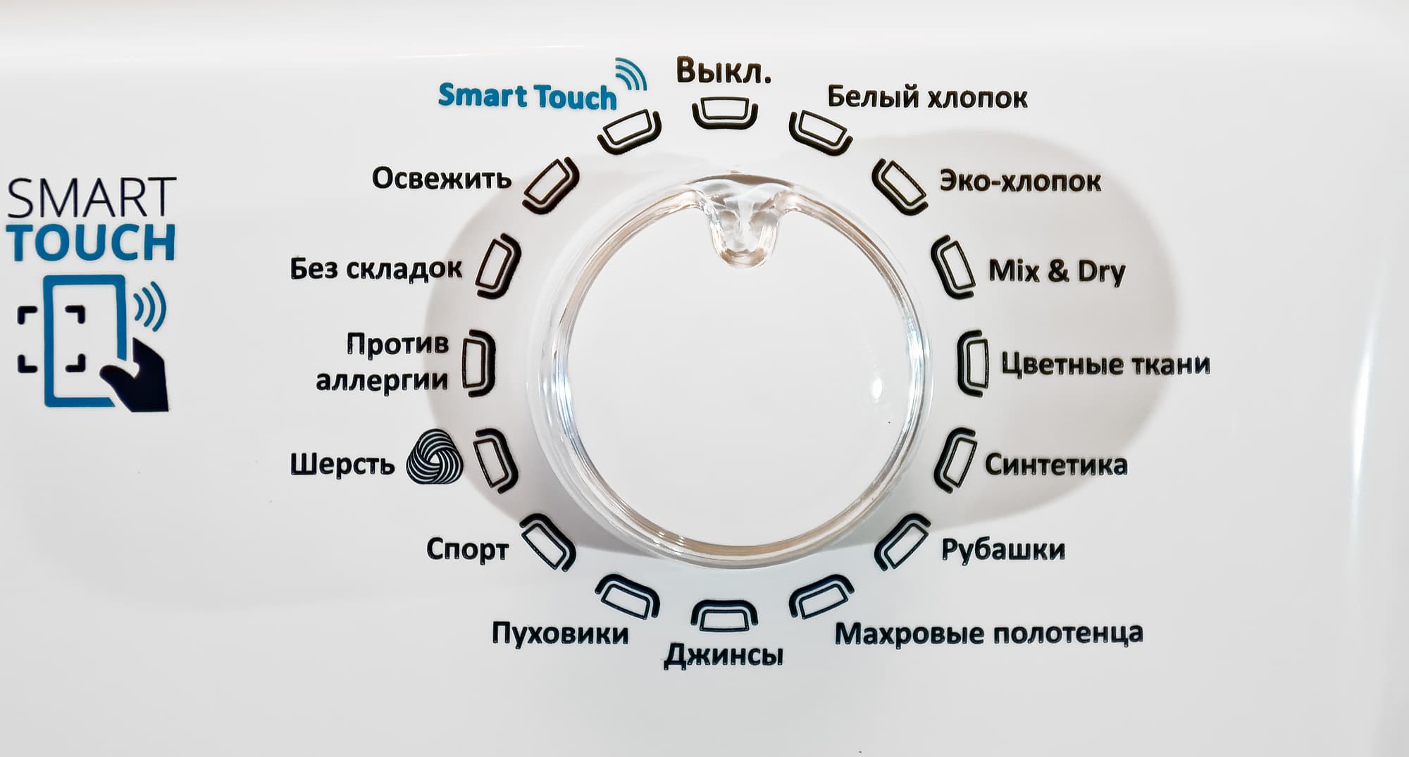 Все кнопки сенсорные. Надпись «Smart Touch» подсказывает, к какому месту прикладывать смартфон для управления агрегатом с помощью NFC. Тут мы впервые удивились: честно говоря, довольно странный выбор интерфейса.