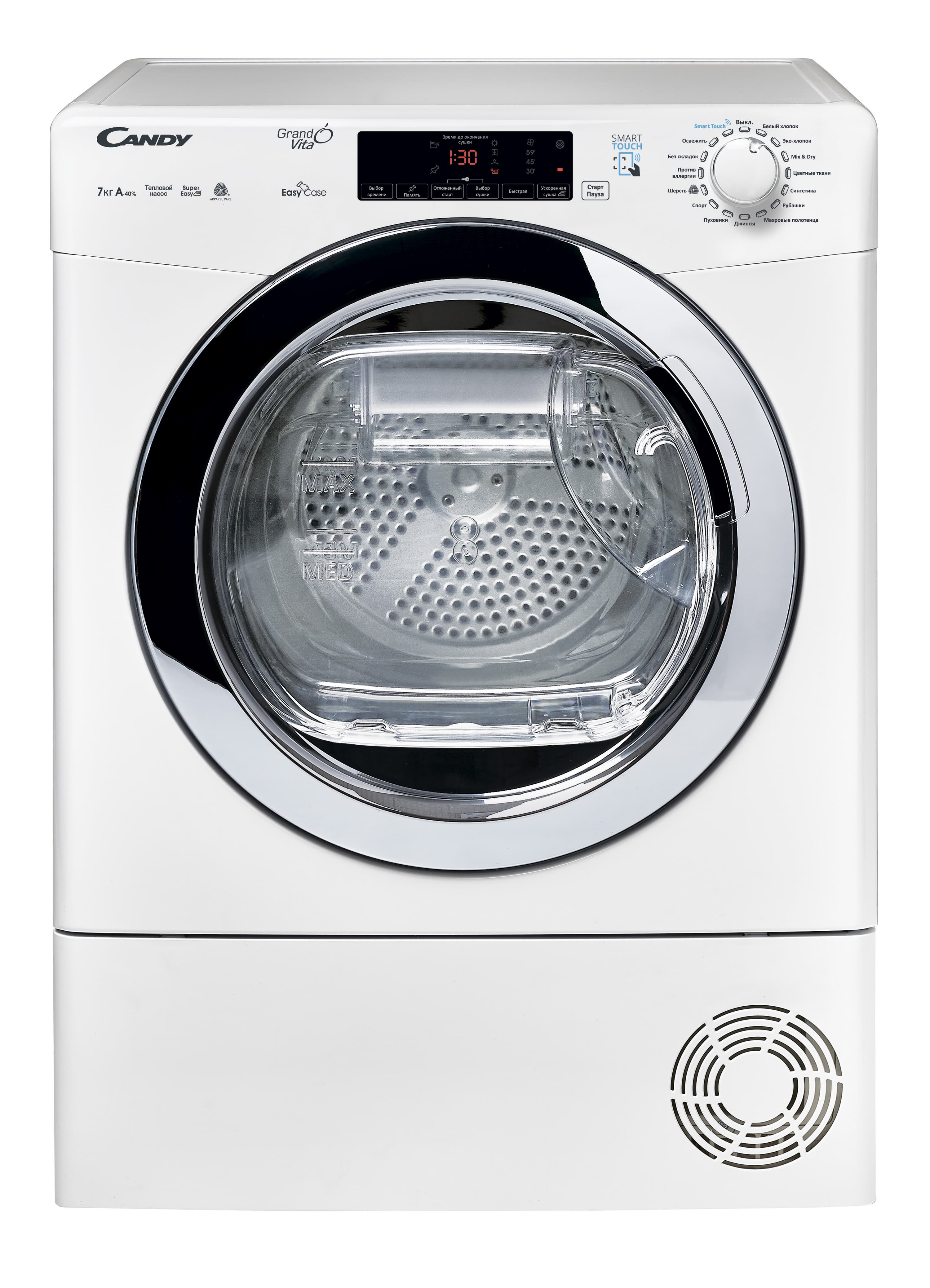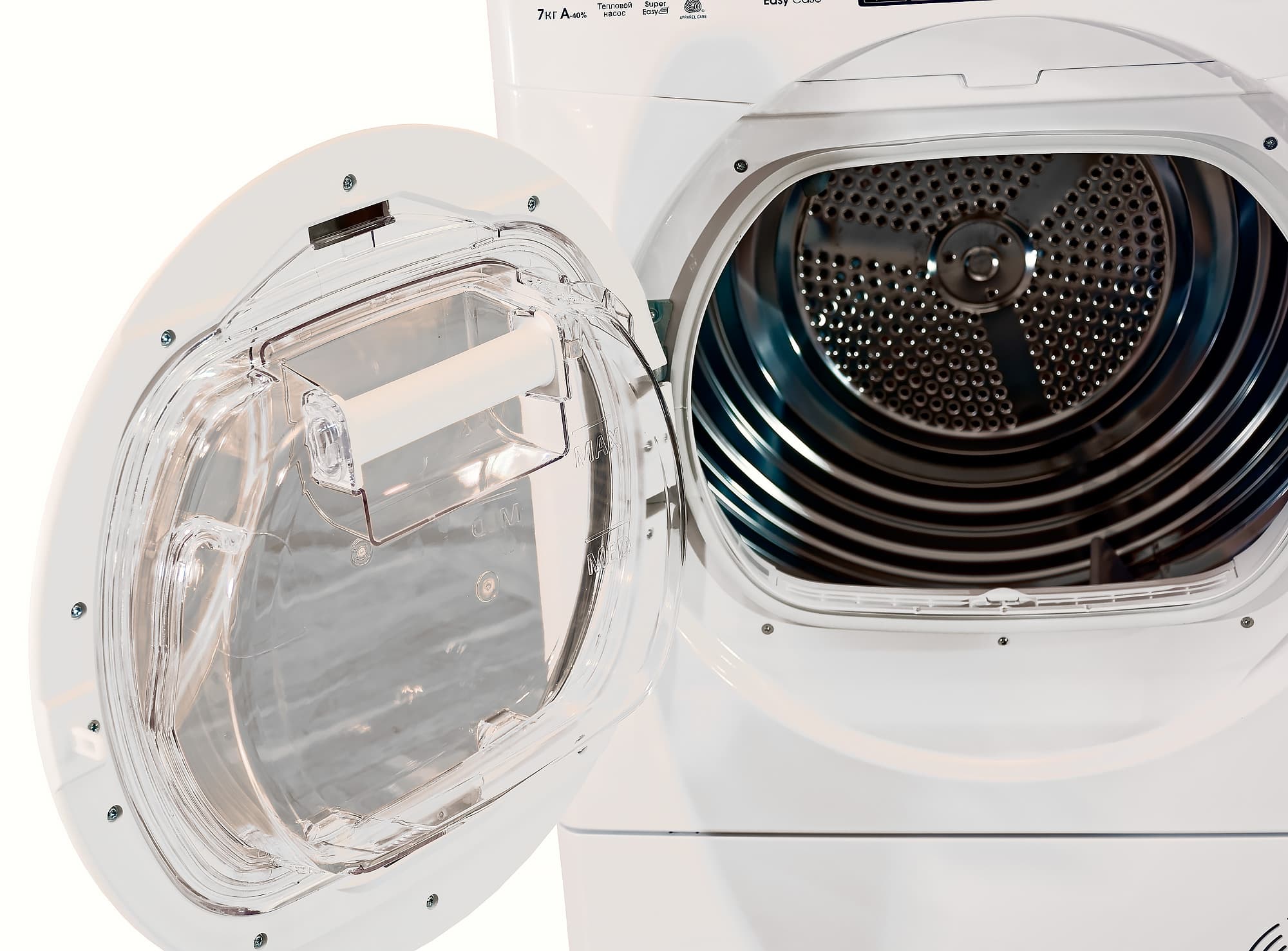 Основное удобство именно выделенной сушильной машины состоит в том, что это позволяет стирать и сушить за один раз действительно много белья. Мы исследовали Candy GVS4H7A1TCEX-07 в комбинации со стиральной машиной с 7-килограммовой загрузкой и убедились в том, что эта сушилка действительно способна высушить ровно столько, сколько стиралка смогла постирать. Напомним, что среднестатистические комбинированные стирально-сушильные машины, как правило, требуют при задействовании сушки ограничить загрузку двумя третями бака.
