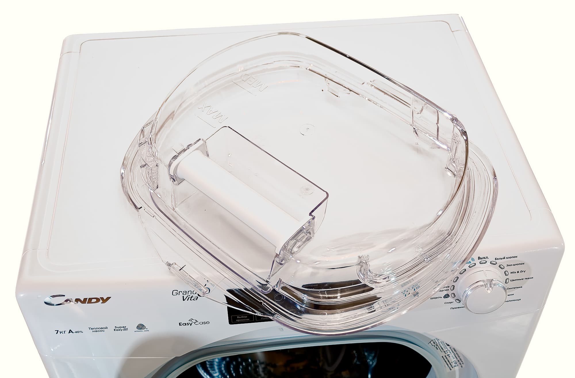 Люк не так прост, как кажется: за прозрачным пластиковым стеклом расположен бак для сбора излишков конденсата. Время от времени его нужно снимать и выливать. Или использовать эту воду по хозяйству: это ведь практически дистиллированная вода. В утюге точно не будет накипи.
