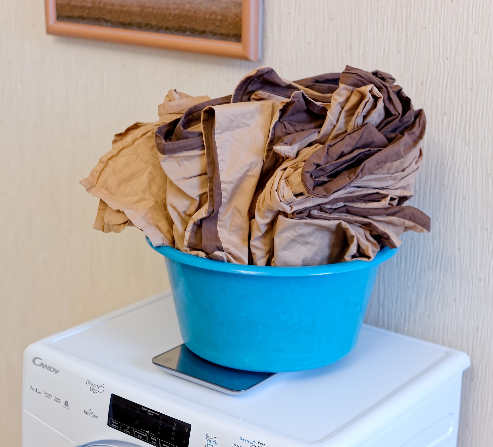 Для усложнения задачи белье было взято «с переподвывертом» — сатиновое, причем хлопковое. По опыту владельцев, по отношению к стирке такое сочетание отличается довольно капризным характером: склонно к заминанию, плохо прополаскивается и плохо отжимается. Тем не менее, полный комплект постельного белья был прополоскан, отжат на 1000 об/мин и отправлен в сушку. Предварительное взвешивание сразу же показало, что задачка сушилке предстоит серьезная...