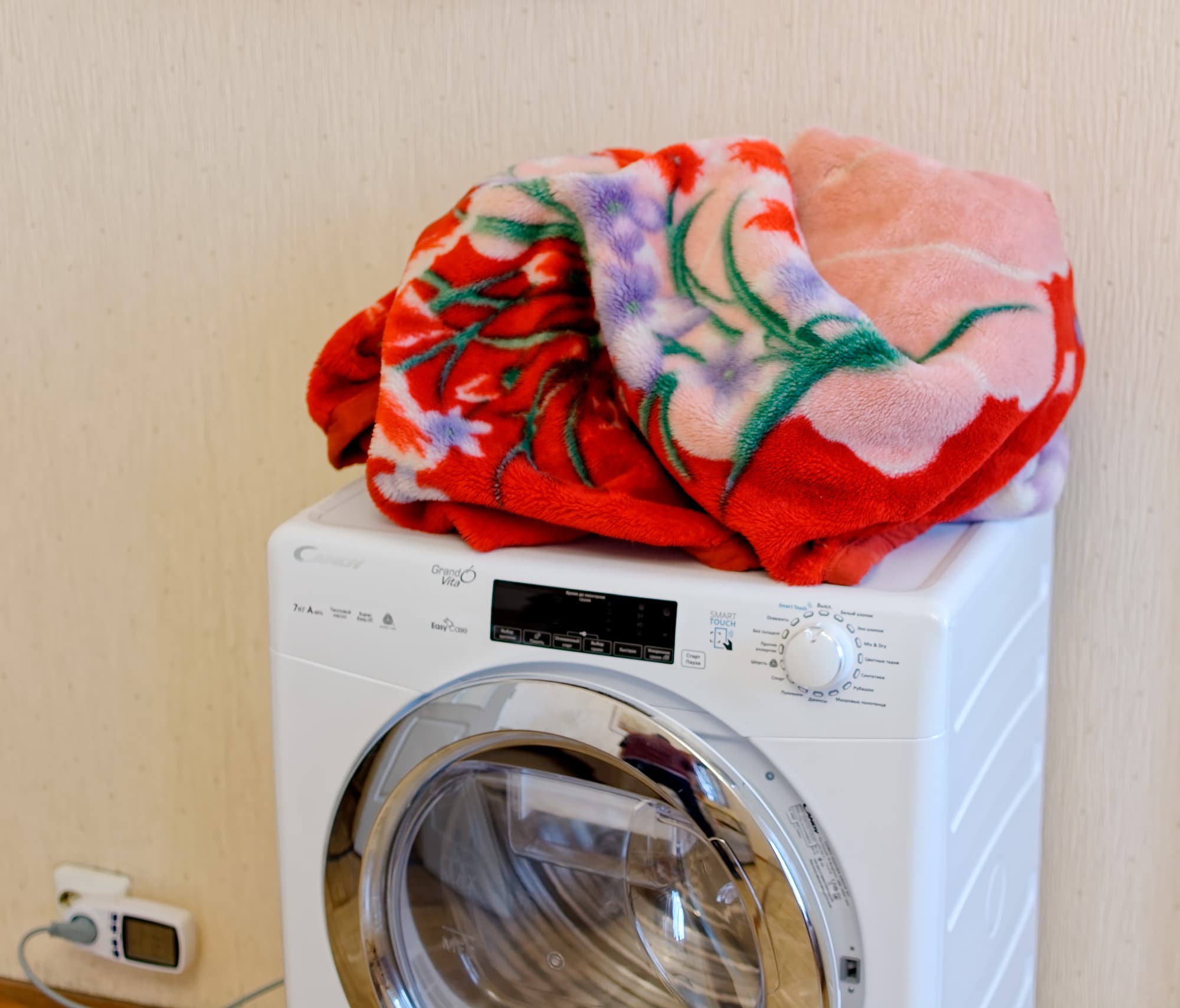 Синтетический плед был отжат в бережном режиме на 600 об/мин — то есть на выходе оказался довольно влажным. Мы решили проверить, как программа для сушки синтетики справится с этой задачей (другую выбирать было боязно — кто его знает, может, для хлопка используется более высокая температура).