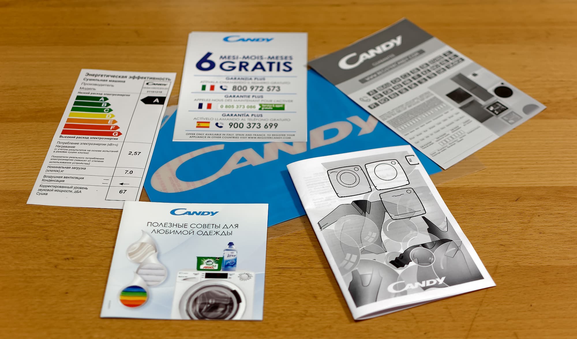 Печатные материалы представлены наклейкой с ТТХ сушилки, гарантийным талоном на множестве языков (русский присутствует), списком сервисных центров в России, Беларуси и Казахстане, листочком с предложением дополнительной, как мы поняли, 6-месячной гарантии, актуальной только для Италии, Испании и Франции, собственно инструкцией пользователя (о чем предлагается догадаться самостоятельно, т. к. никаких надписей на обложке этой книжечки нет) и полурекламной-полуинформационной брошюрой «Полезные советы для любимой одежды». Некоторые советы действительно полезны (например, как удалить с ткани воск от свечи), но навязчивое присутствие везде упоминаний Ariel и Lenor несколько раздражает.