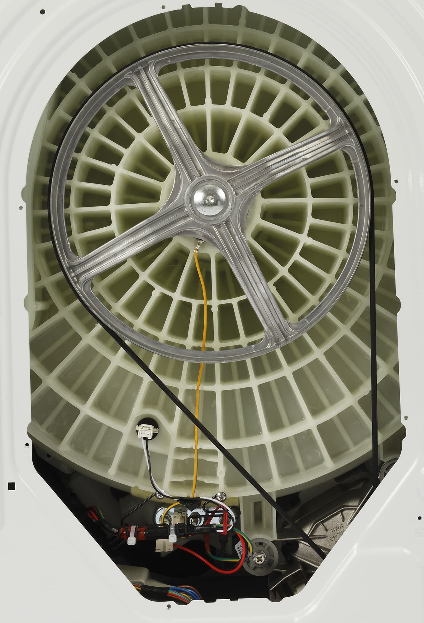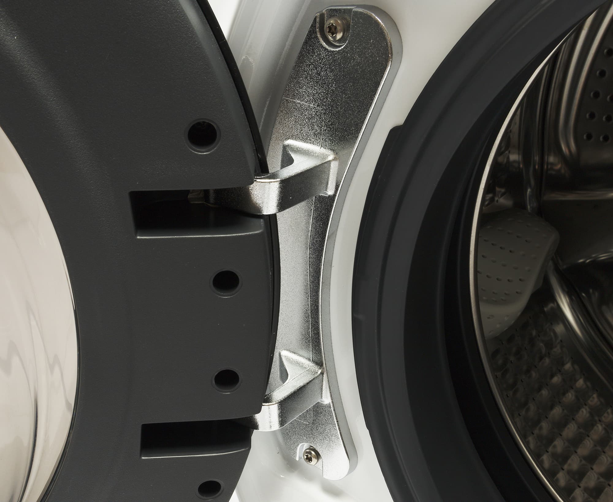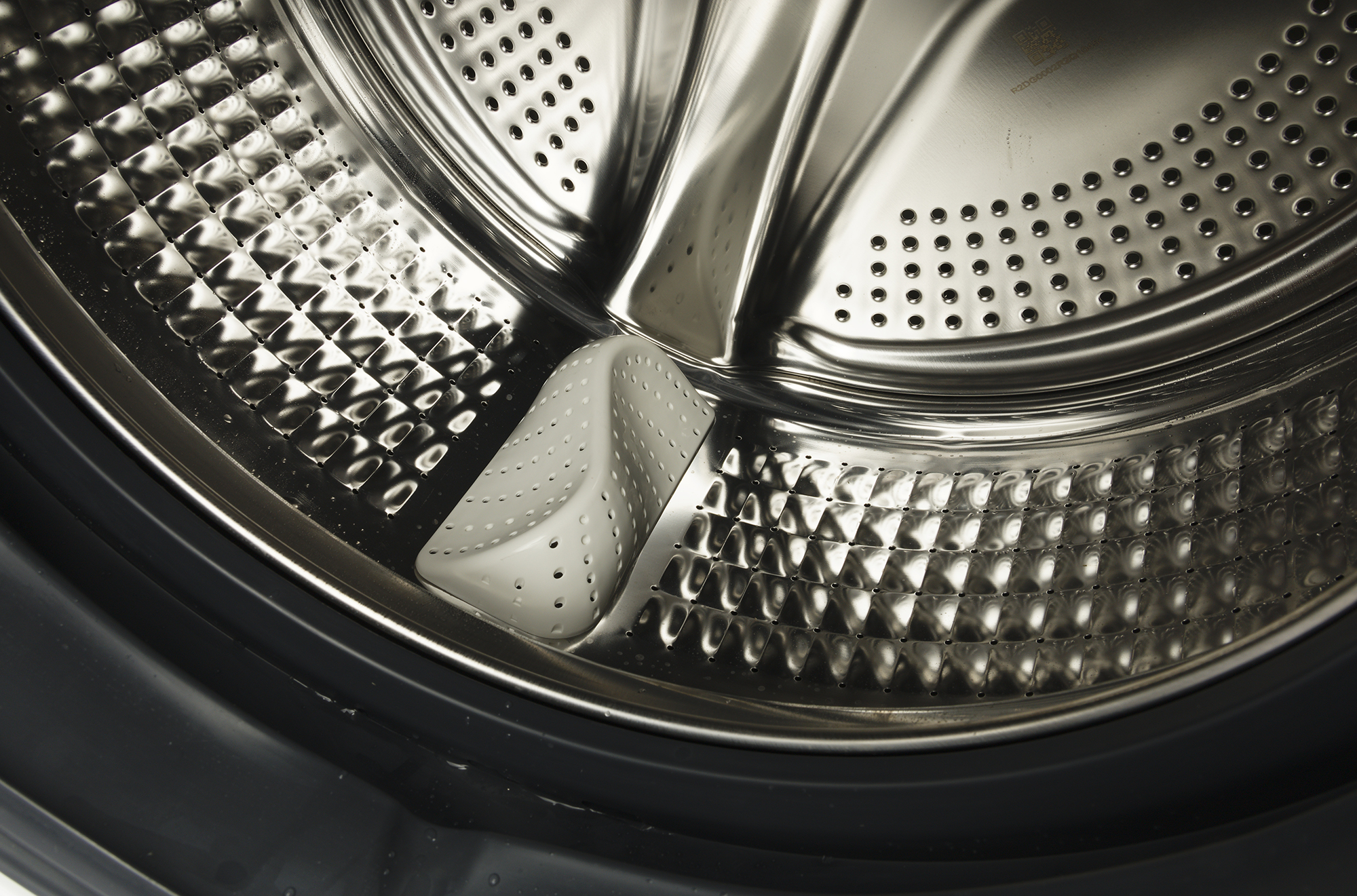 Внутренняя поверхность барабана покрыта выштамповкой, улучшающей гидродинамику, и снабжена чуть изогнутыми пластиковыми бойниками, перемешивающими белье. Перфорация нанесена как на боковые стенки, так и на заднюю.