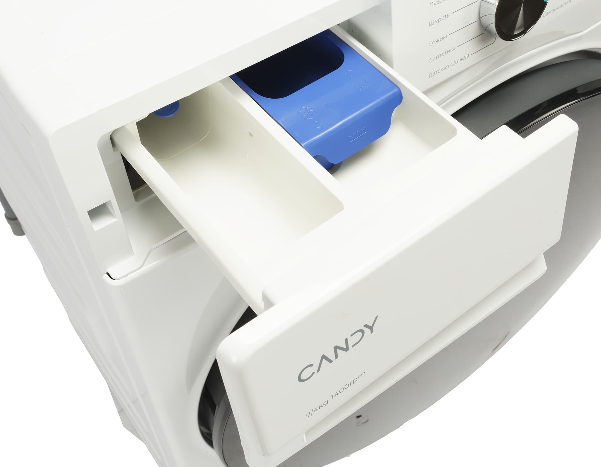 Отсек для моющих средств состоит из трех частей: слева емкость для жидкого или порошкообразного средства, справа — ванночка для кондиционера. В левой части также находится фиксатор для извлечения контейнера. В правой — дополнительный отсек, обычно использующийся для предварительной стирки. Однако в нашей модели он не используется, так что какого-либо практического применения для него нет. Полностью выдвинутый лоток открыванию дверцы не мешает.