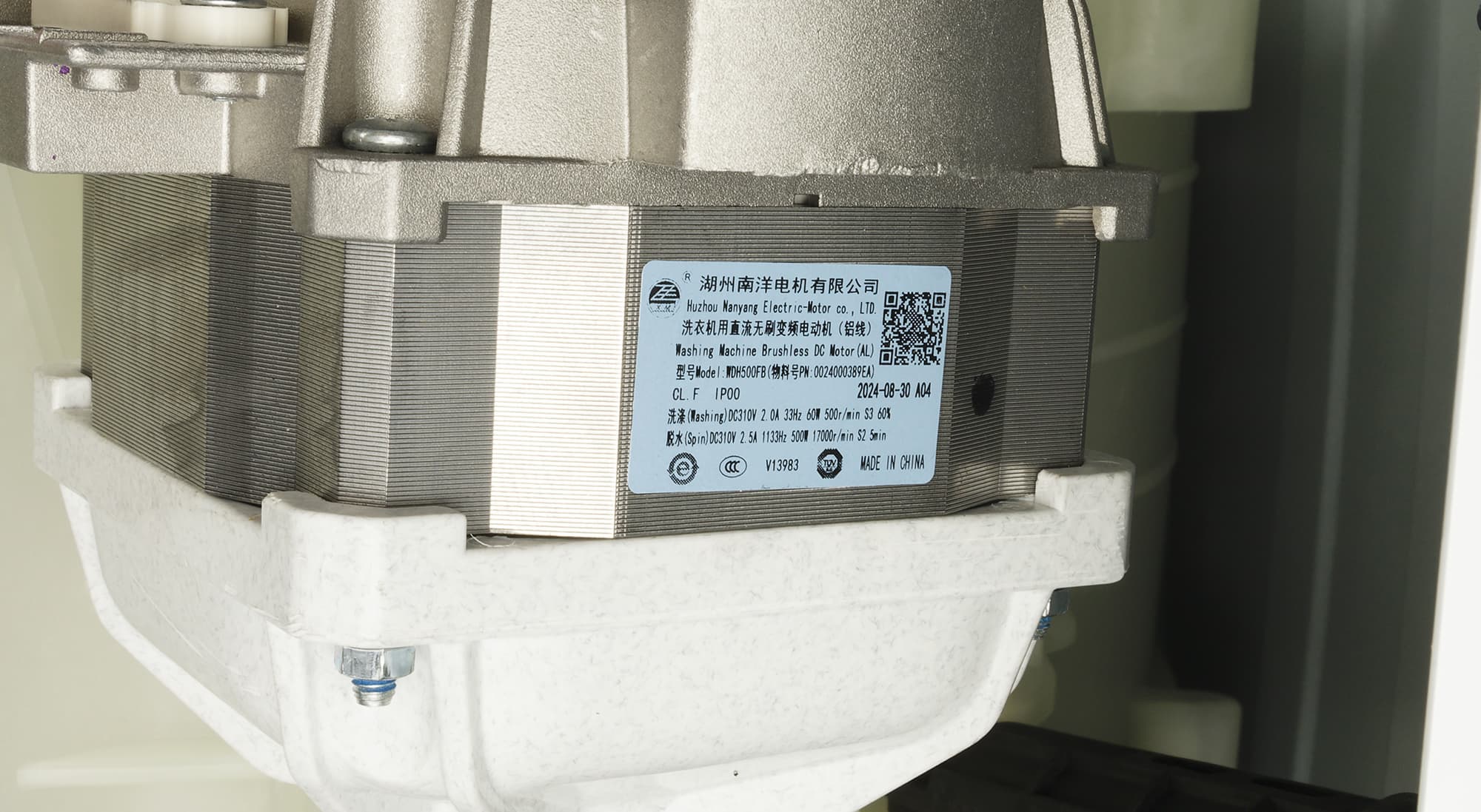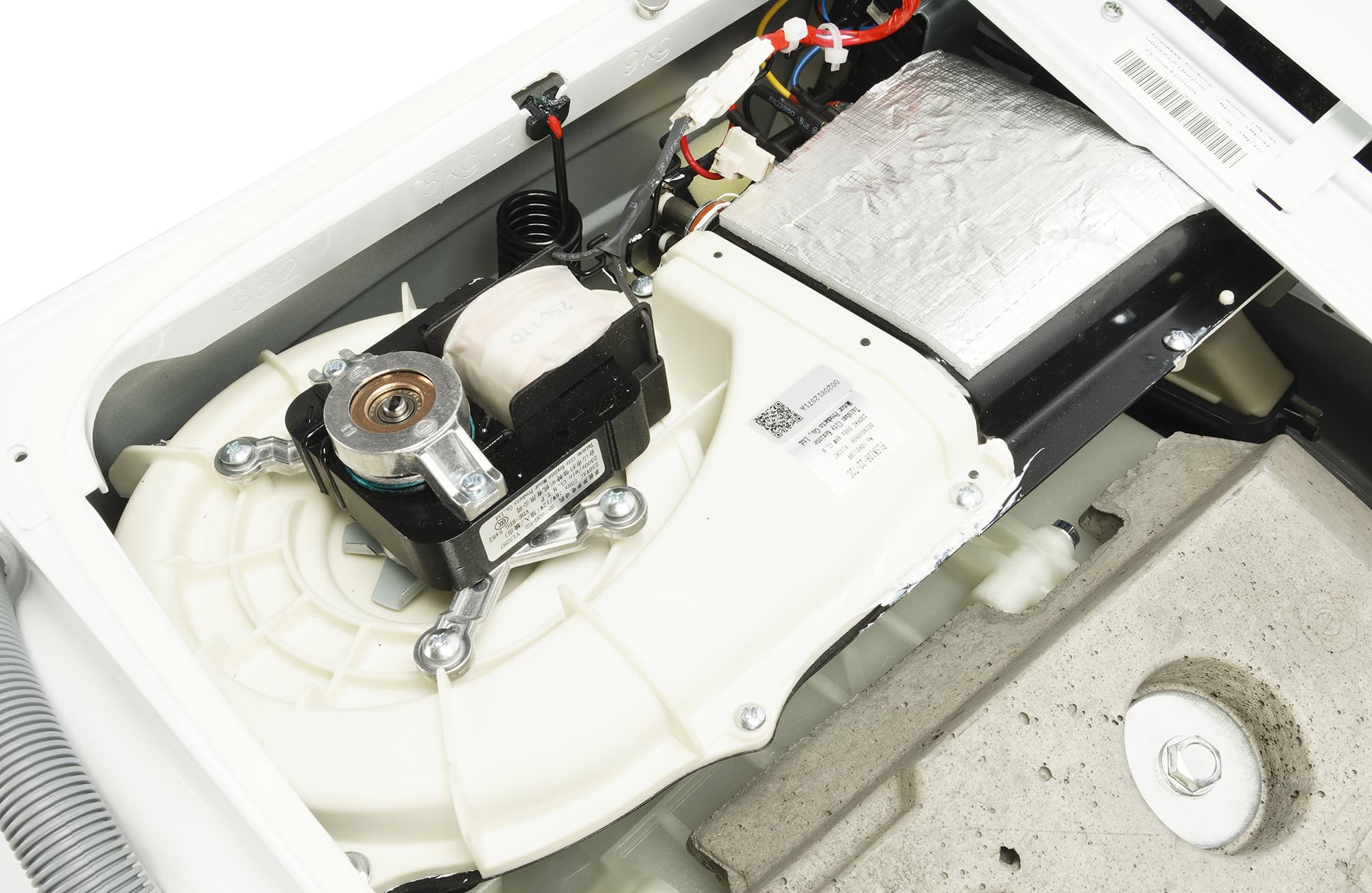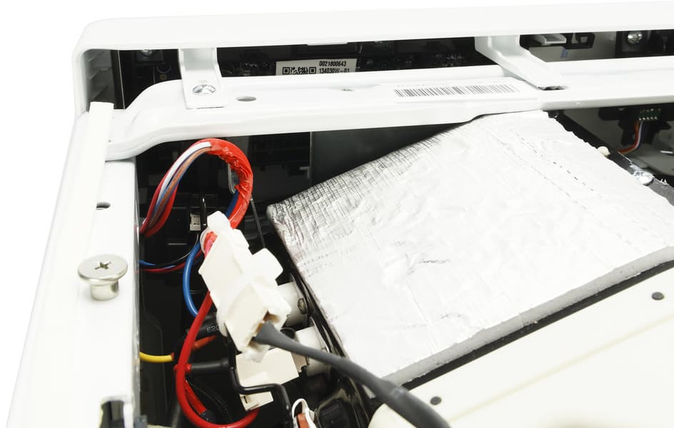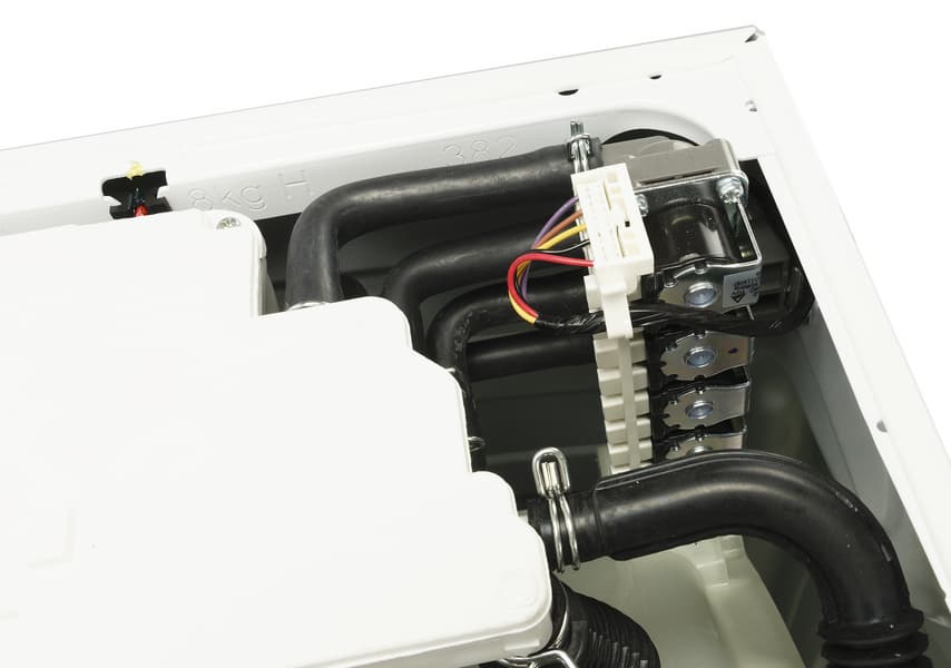 Вскрыв упаковку, внутри мы обнаружили саму машину с установленным сливным шлангом, простой заливной шланг (без специальных приспособлений, контролирующих отсутствие протечек), кронштейн для монтажа шланга, заглушки для установки на место транспортировочных болтов, антишумовой поролон, руководство пользователя и обязательную наклейку с информацией об энергетической эффективности.