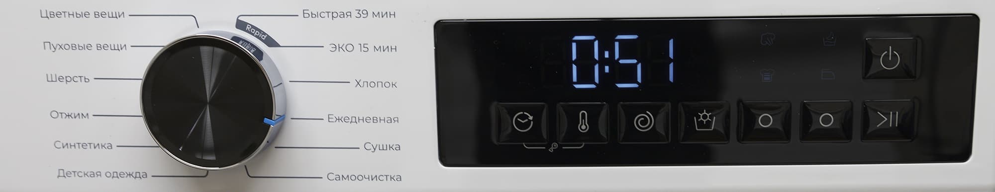 Программы выбираются при помощи цилиндрического селектора, расположенного по центру панели управления. Названия сценариев нанесены на корпус вокруг самой ручки.