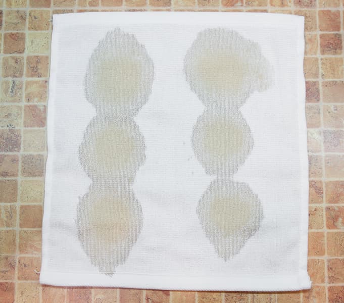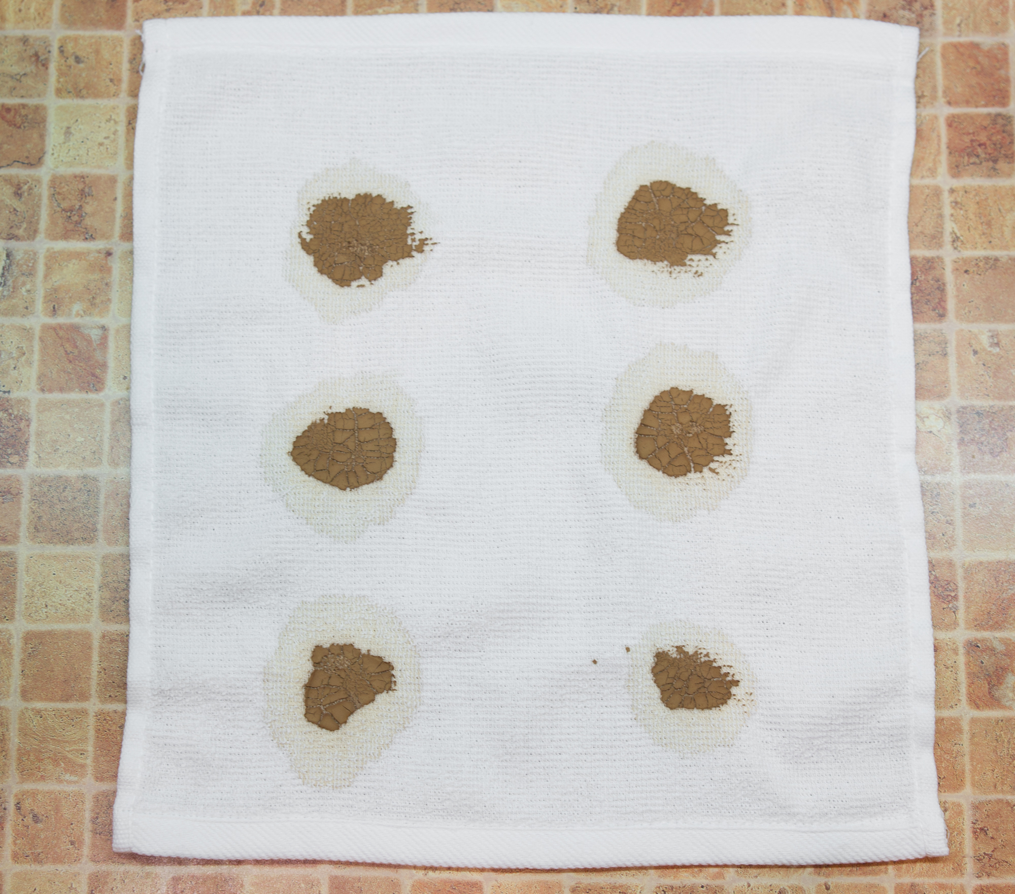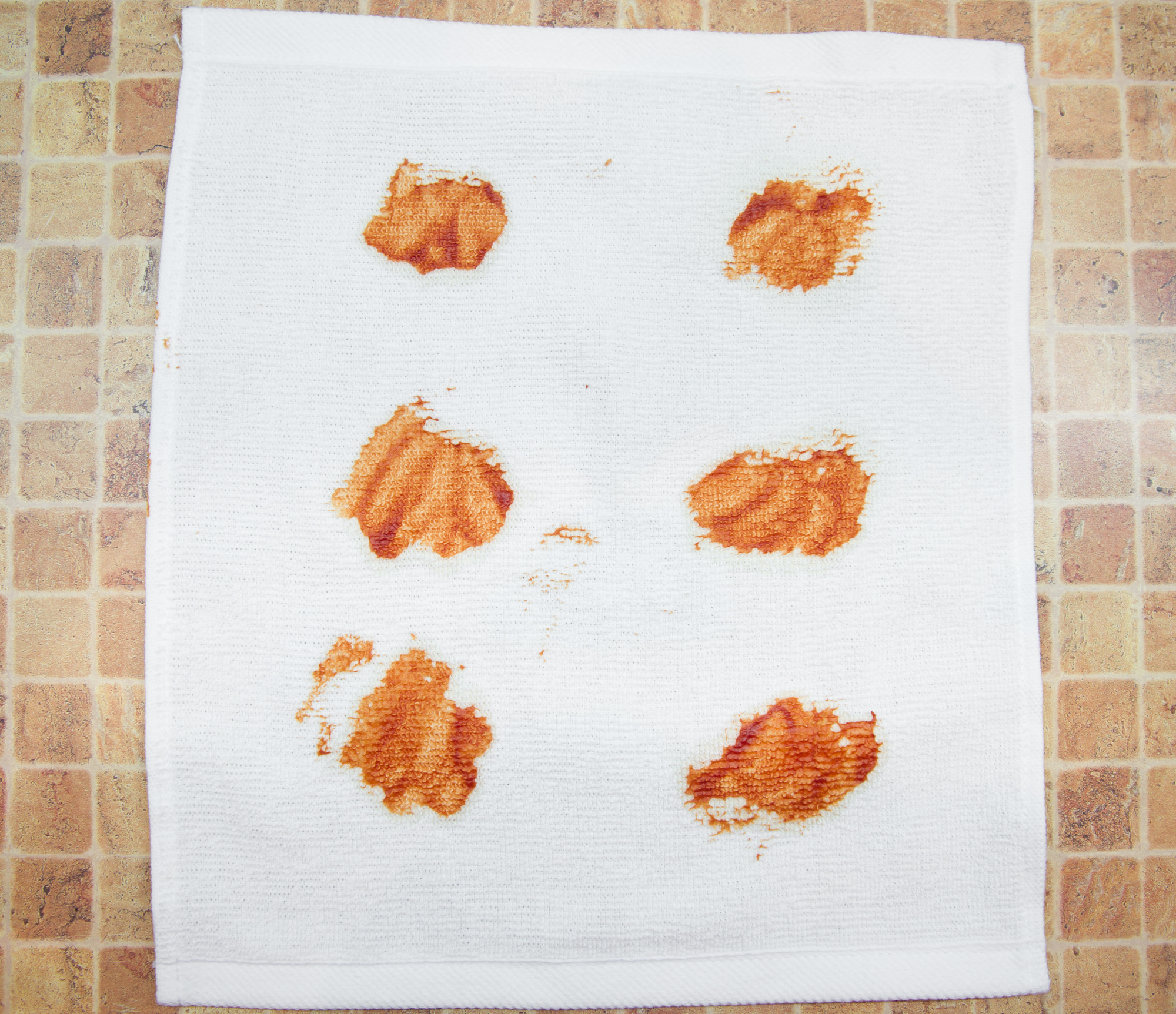 Мы запачкали белые хлопковые полотенца теми органическими веществами, которые часто встречаются и трудно отстирываются. На каждое полотенце попала своя грязь: красное вино, кетчуп, соевый соус и какао. Все это сохло при комнатной температуре в течение суток.