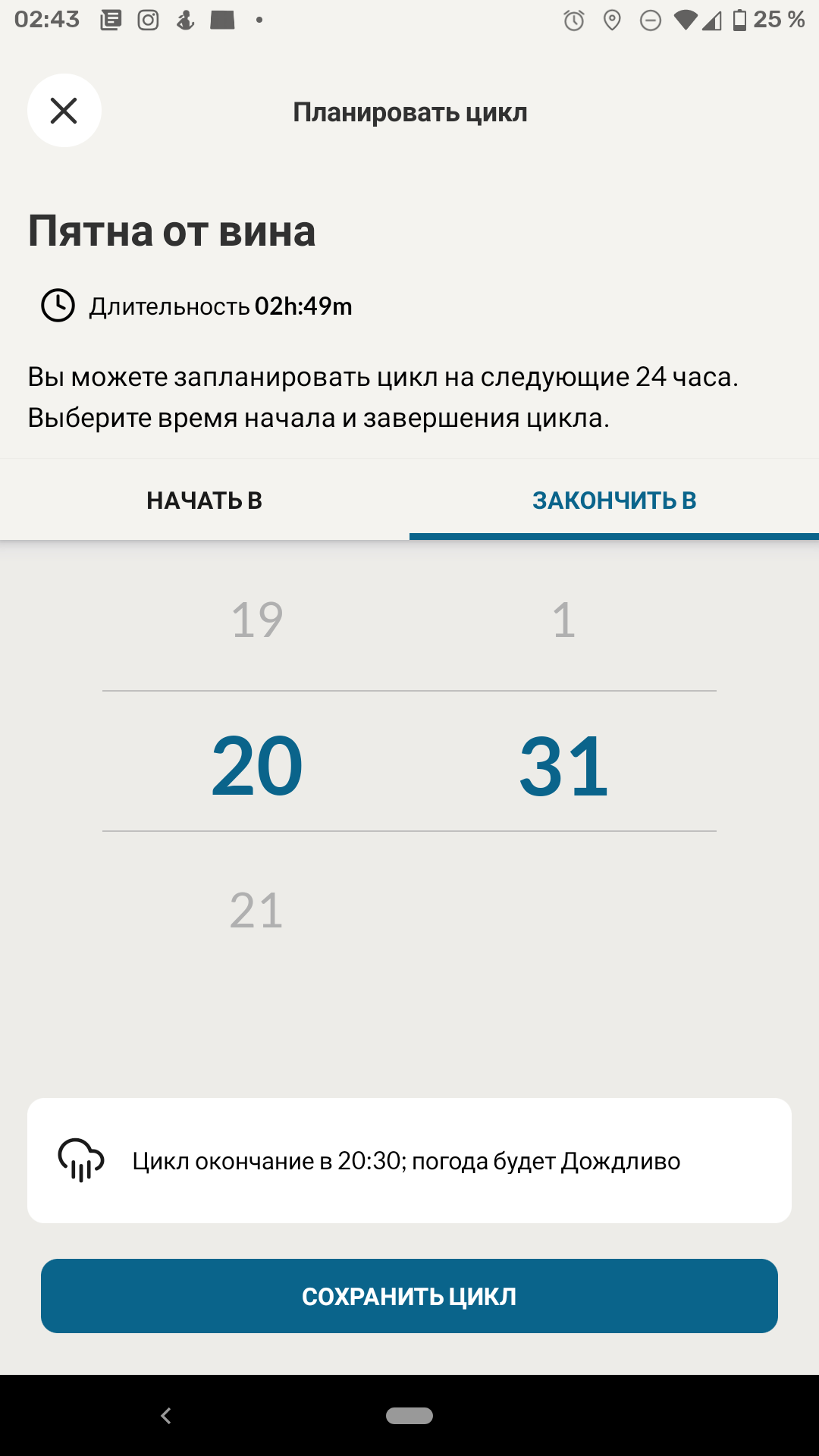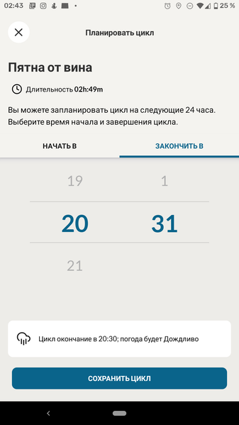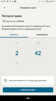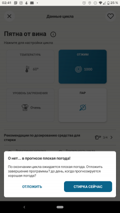 Конечно, главное, для чего стиральной машине требуется мобильное приложение — это возможность запустить с его помощью выбранный цикл. После загрузки барабана hOn оценивает время работы программы и — в первый раз это было очень неожиданным — сообщает прогноз погоды к ожидаемому окончанию (вот для чего нужно было определение местоположения). Поразмыслив, мы поняли, что эта функция может оказаться полезной для тех, кто сушит белье на открытом воздухе или балконе: любителям проветривать белье на улице полезно знать о приближающемся дожде. Для всех остальных проверку прогноза можно отключить в настройках приложения.