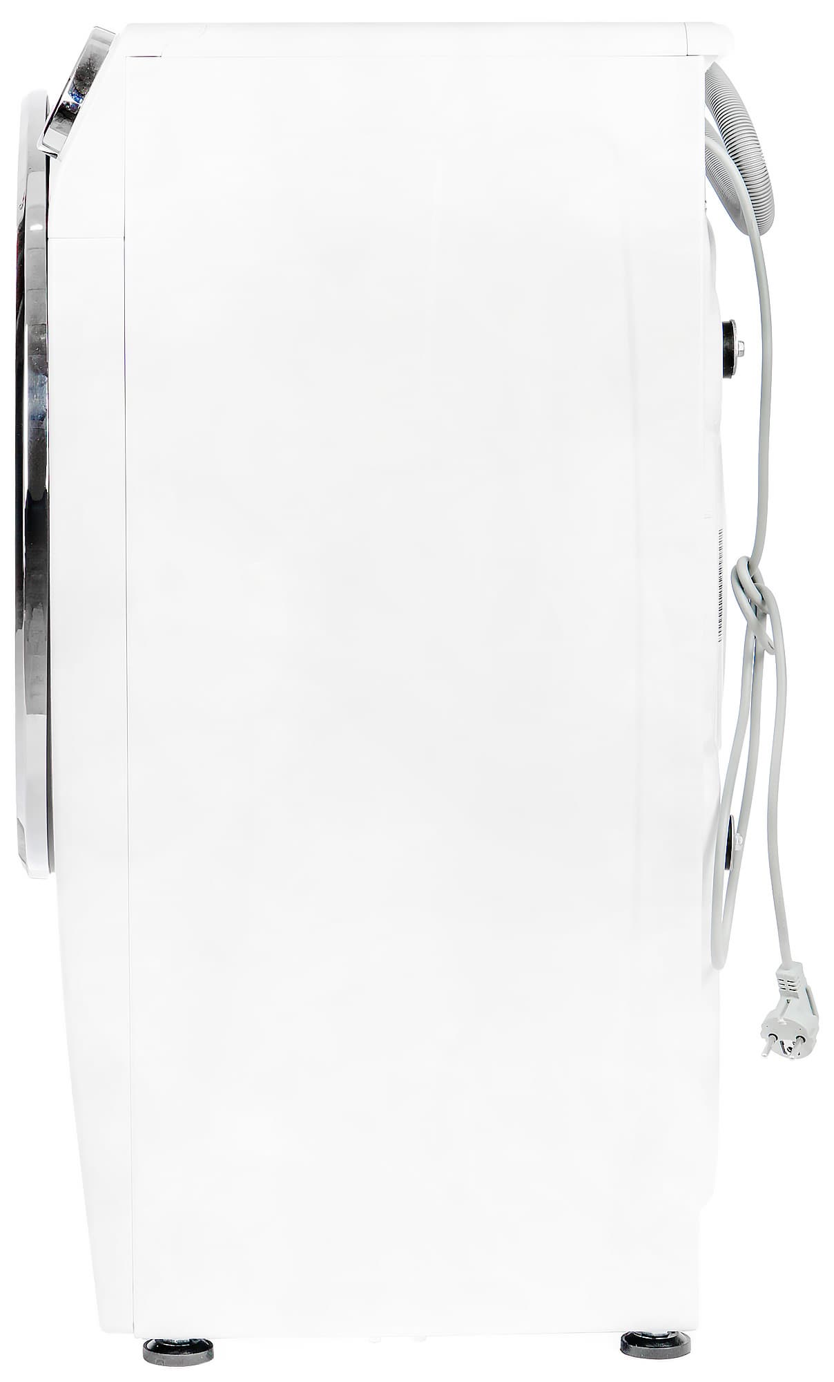 У этой стиральной машины классический дизайн: белый корпус, прозрачный люк с окантовкой из металлизированного пластика, лоток для моющих средств в левой верхней части передней панели, дисплей сверху посередине и круглая ручка селектора программ справа.