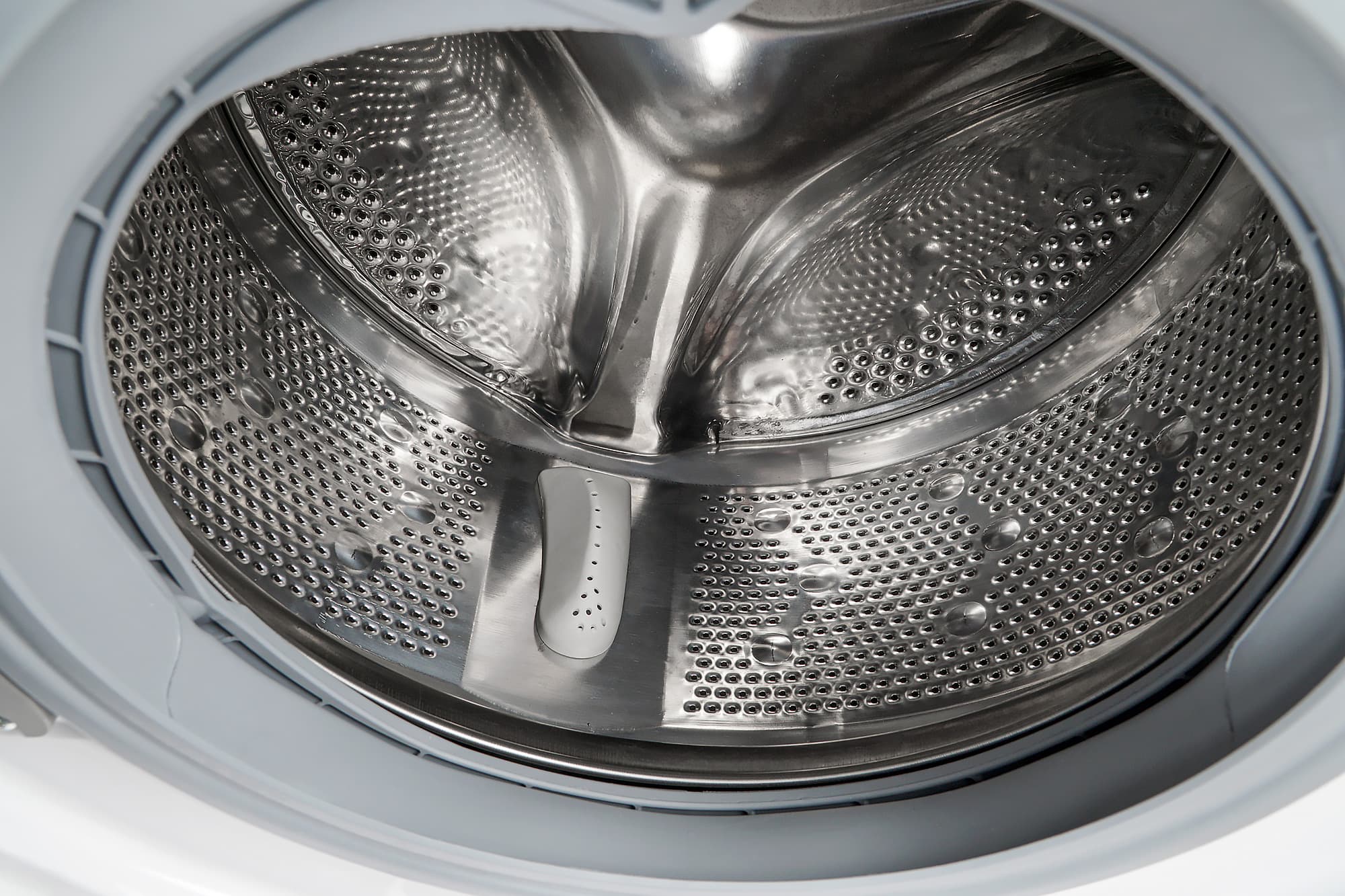 Барабан выполнен из нержавеющей стали с перфорацией как на торцевой стенке, так и по периметру. На стенках у него специальные круглые выступы, расположенные группами по три: вероятно, они призваны как-то улучшить гидродинамику. Ребра барабана пластиковые и также снабжены перфорацией.